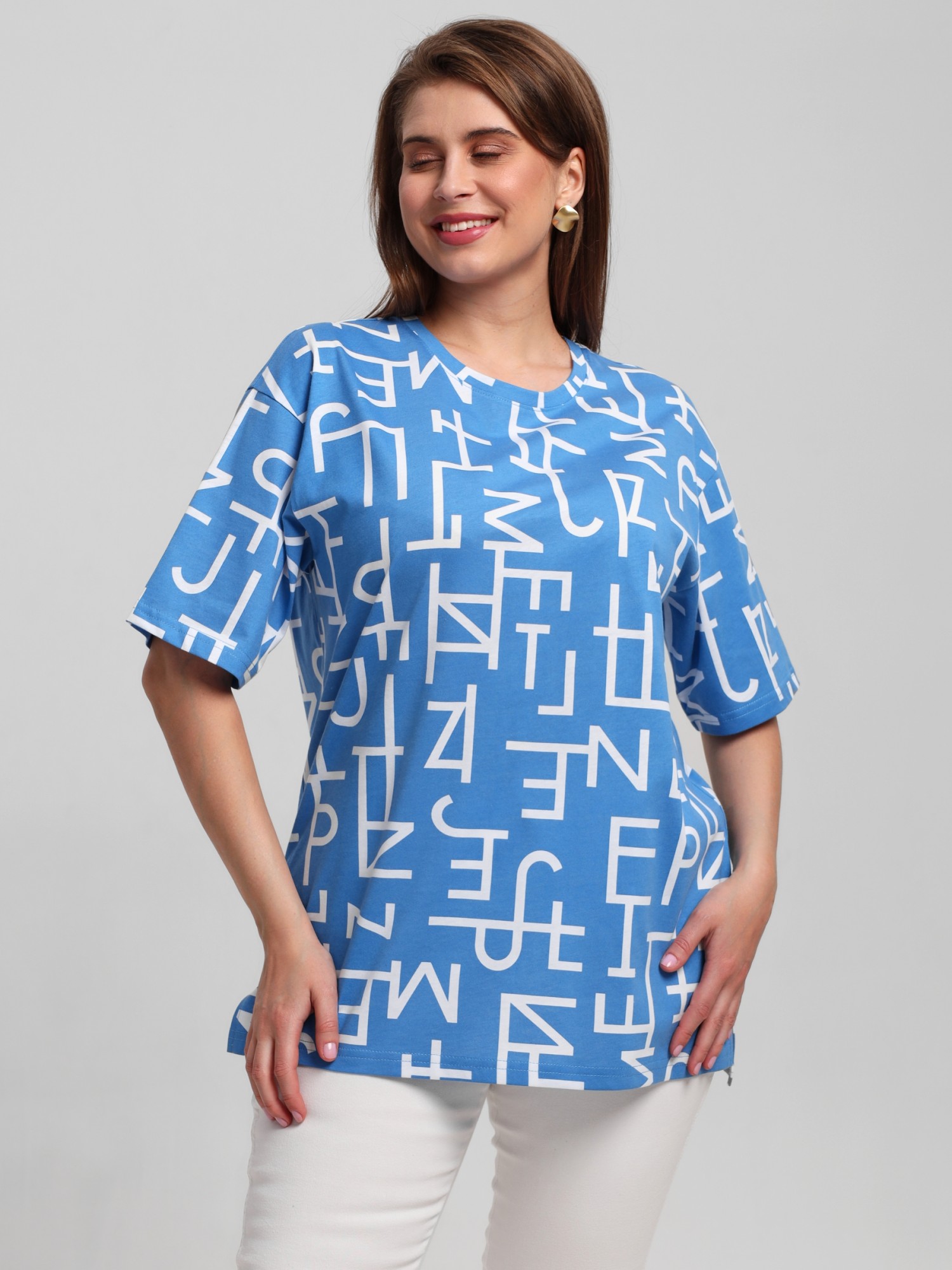 Футболка женская из трикотажного полотна «кулирка» с набивным рисунком, свободного покроя, со спущенным плечом и втачными рукавами длиной до локтя, горловиной овальной формы, обработанной притачной бейкой, в нижней части боковых швов – разрезы.