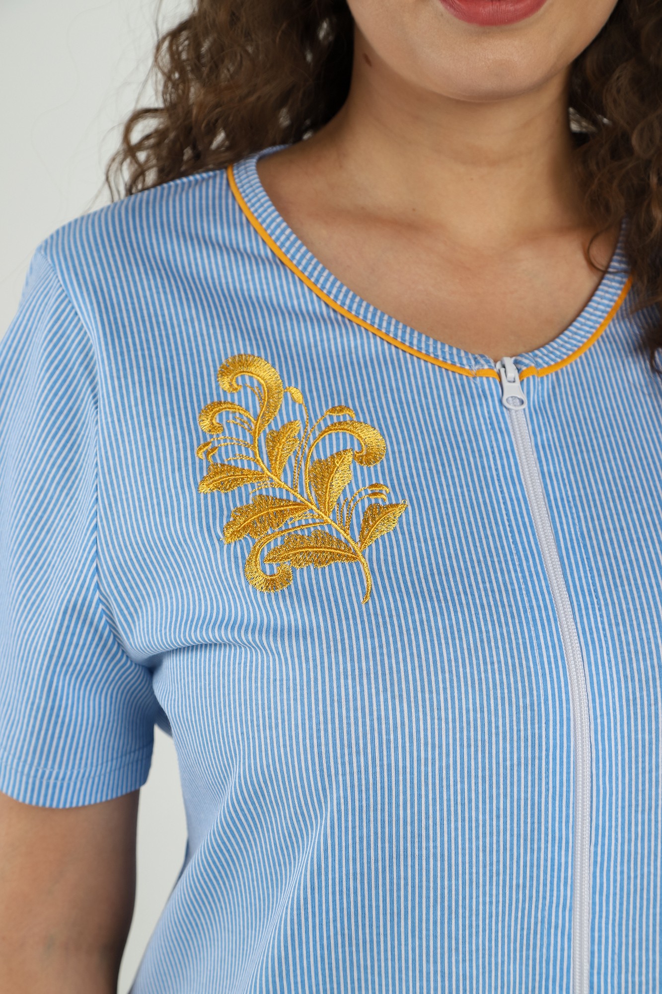 Халат из трикотажного полотна «кулирка» с набивным рисунком в полоску, прямого силуэта, с короткими втачными рукавами, горловиной овальной формы, карманами в боковых швах и центральной бортовой застежкой на тесьму «молния». Горловина и входы в карманы окантованы двойным кантом.