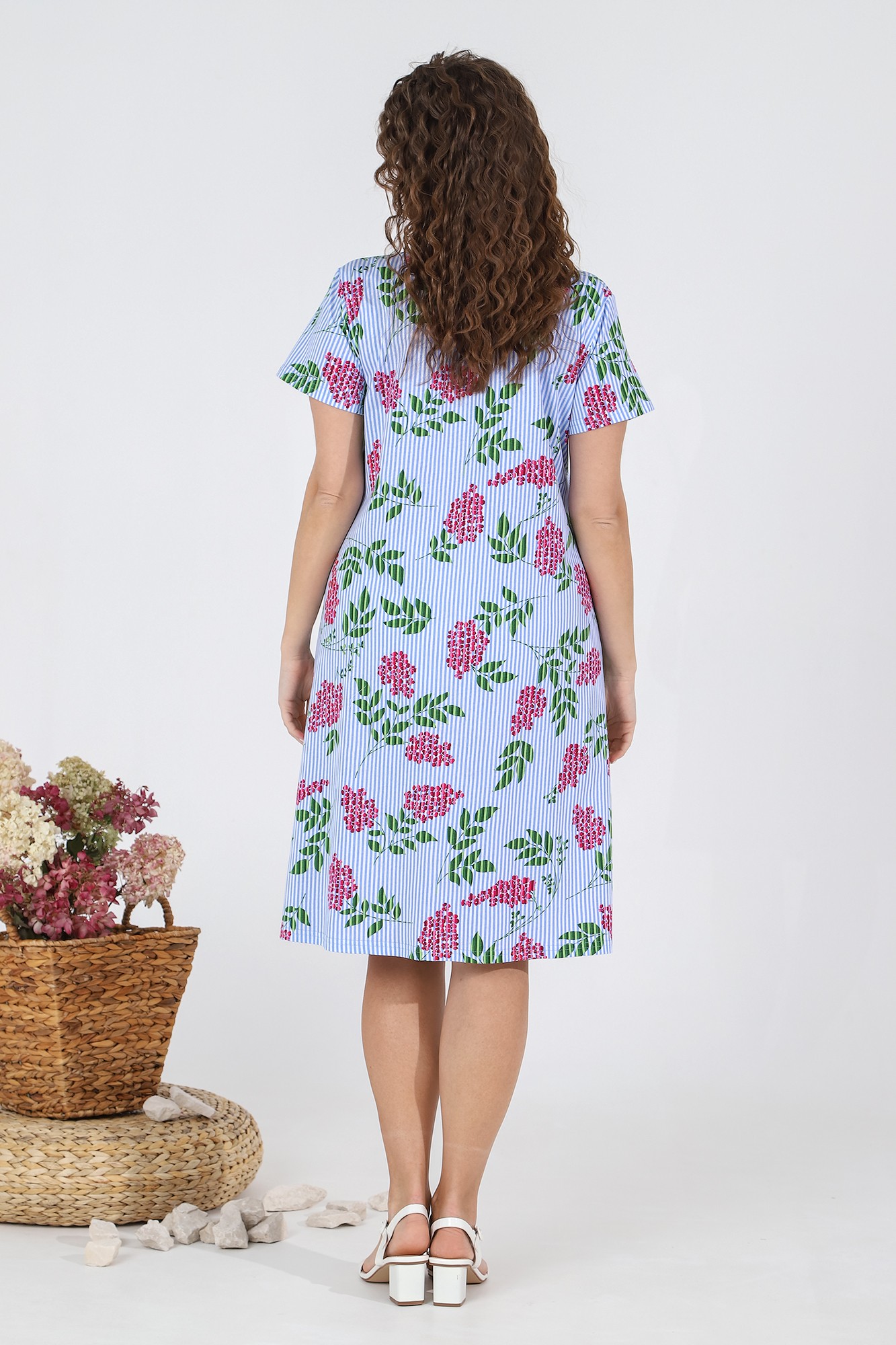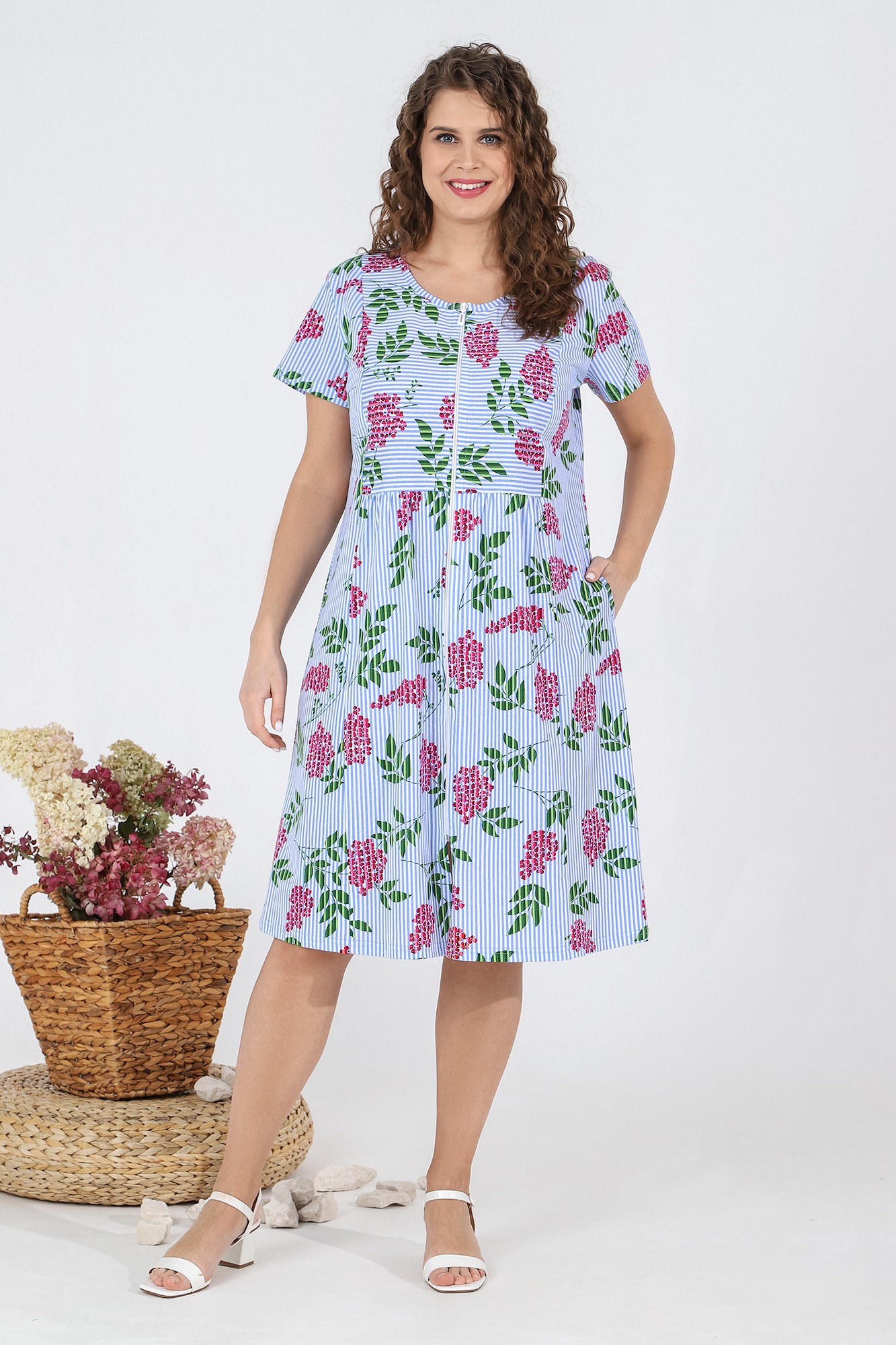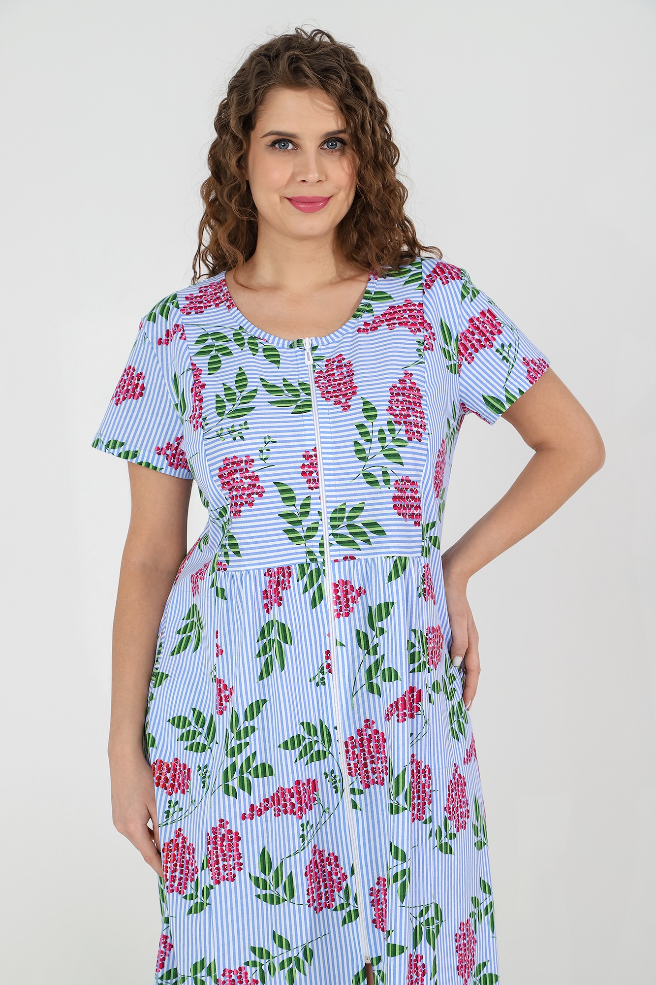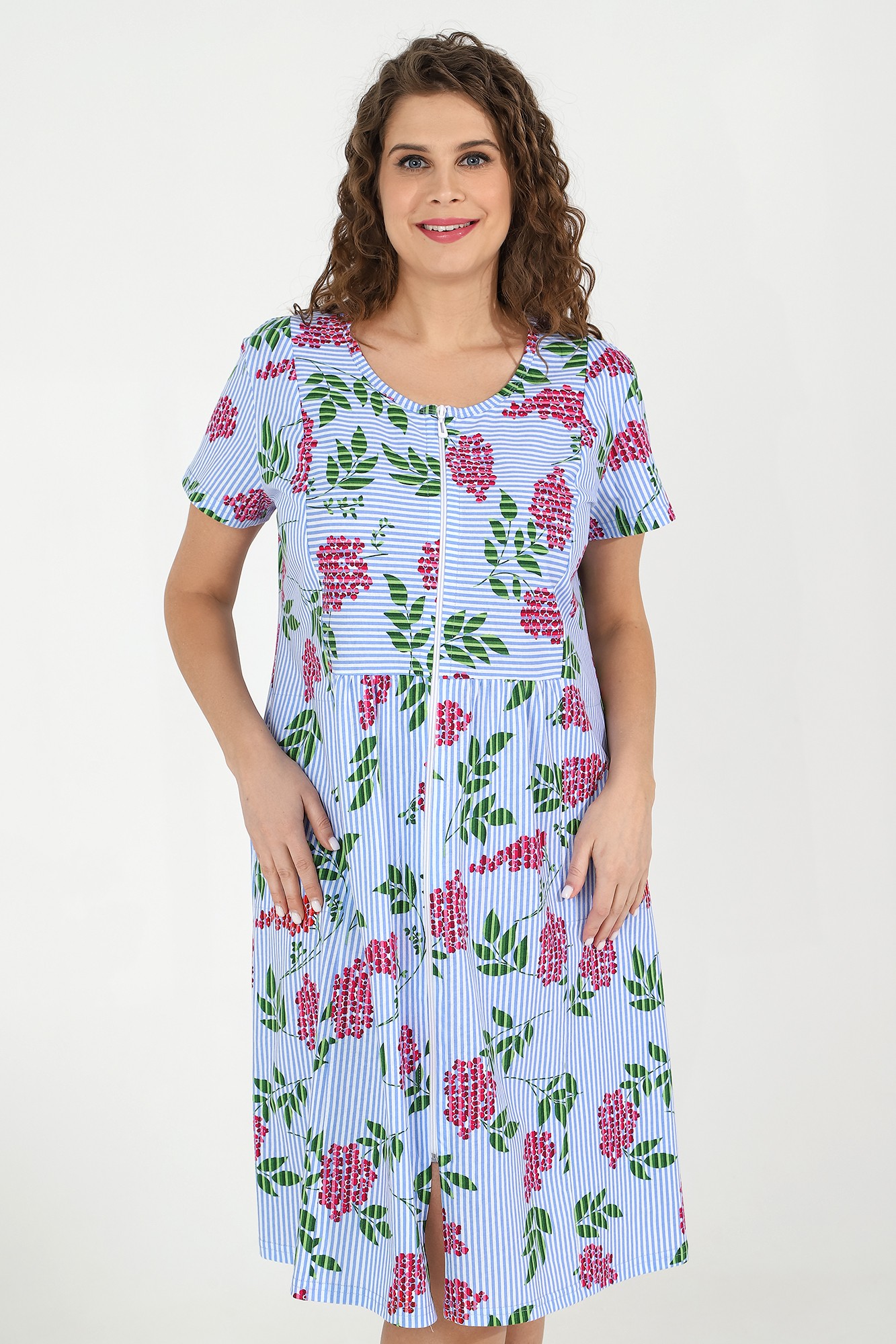 Халат из трикотажного полотна «кулирка» с набивным рисунком, свободного покроя, расширенный книзу, с короткими втачными рукавами, горловиной овальной формы, карманами в боковых швах и центральной бортовой застежкой на тесьму «молния». Полочка – с рельефами, выходящими из плечевых швов. Центральные части полочек – из двух частей каждая. Нижние центральные детали полочек присборены по швам стачивания с верхними. Окантовка входов в карманы и горловины, а также рельефные швы и швы соединения верхних центральных деталей переда с нижними выполнены с узким белым кантом.