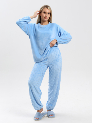 Костюм молодежный из трикотажного полотна «велсофт» в комбинации двух видов, состоящий из джемпера и брюк. Джемпер – из гладкого полотна, свободного покроя, с длинными втачными рукавами, нижние срезы которых обработаны эластичной тесьмой,и горловиной овальной формы, обработанной втачной планкой. С левой стороны на полочке вышивка.Брюки - из полотна со стриженым узором «сердечки», без карманов, с эластичной тесьмой по талии и нижним срезам.