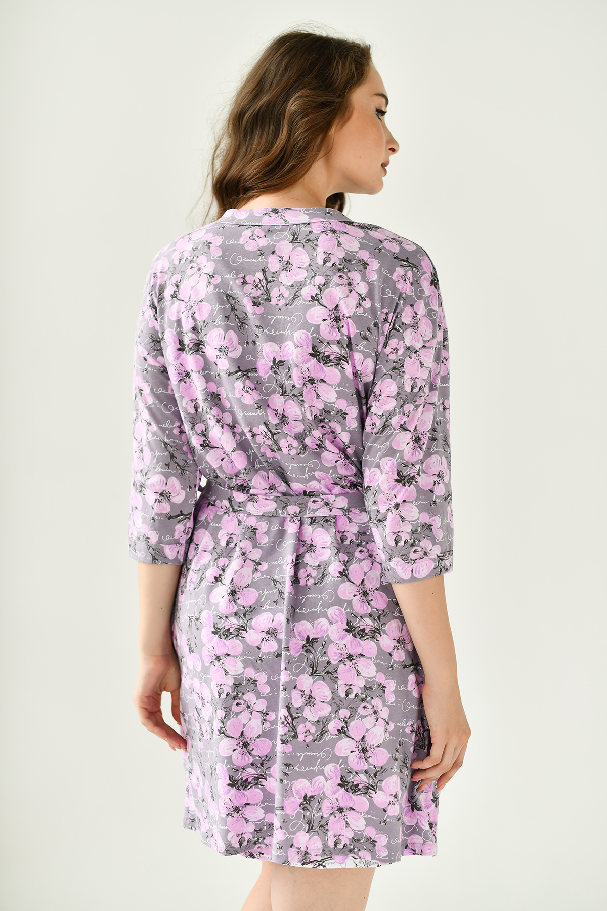 Пеньюар запашной с поясом, из набивного х/б трикотажного полотна, с втачным рукавом длиной ¾.