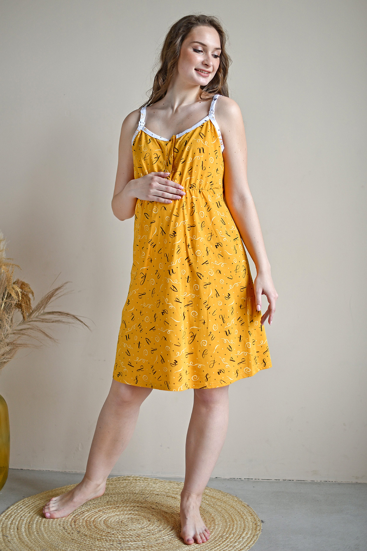 Сорочка женская из набивного полотна полуприлегающего силуэта на бретелях. Полочка отрезная выше линии талии. Верх полочки на кнопках, низ – на резинке. Горловина и проймы окантованы бейкой из основного полотна. Изделие имеет регулируемые бретели и отстёгивающуюся верхнюю часть полочки.