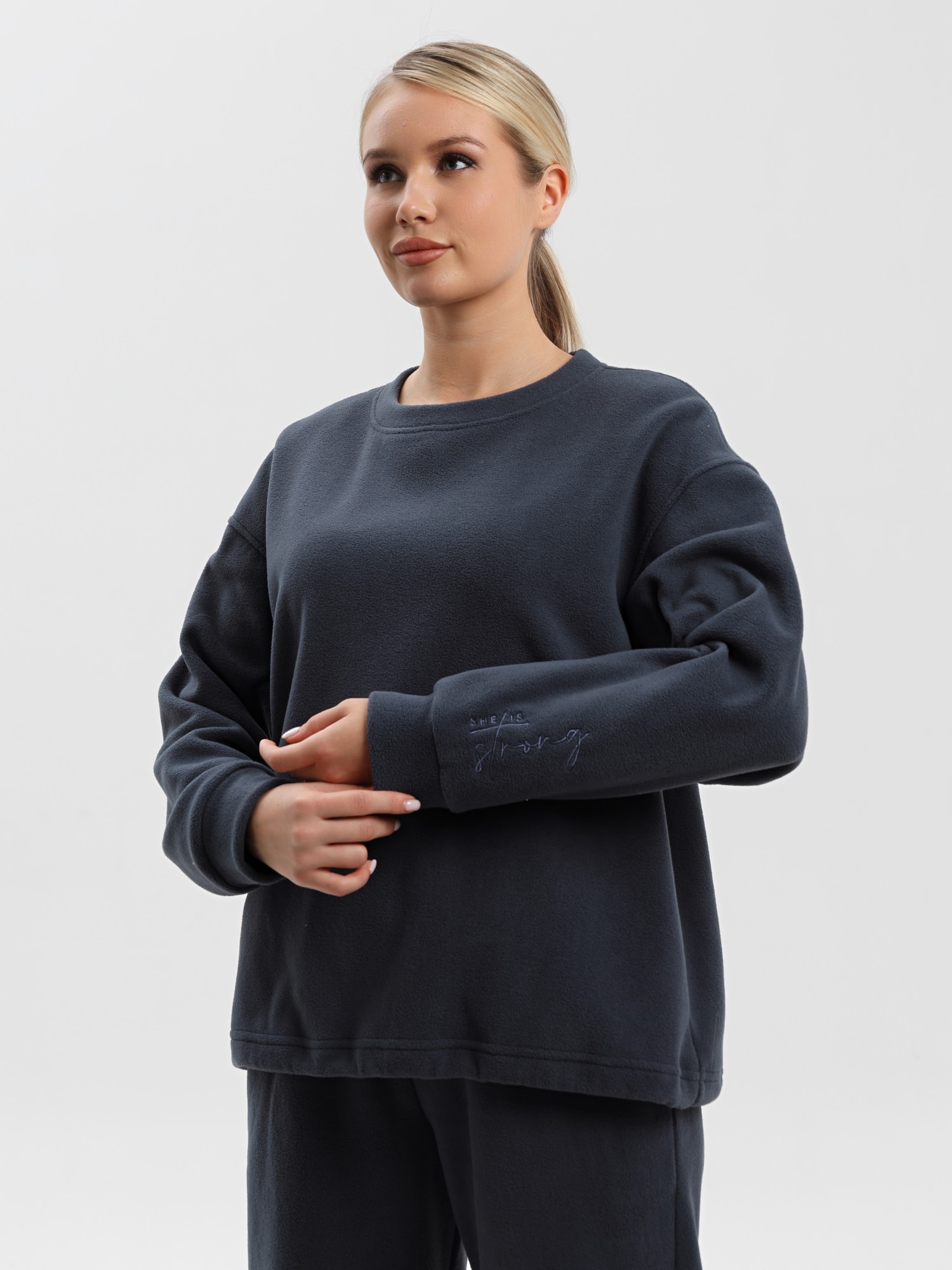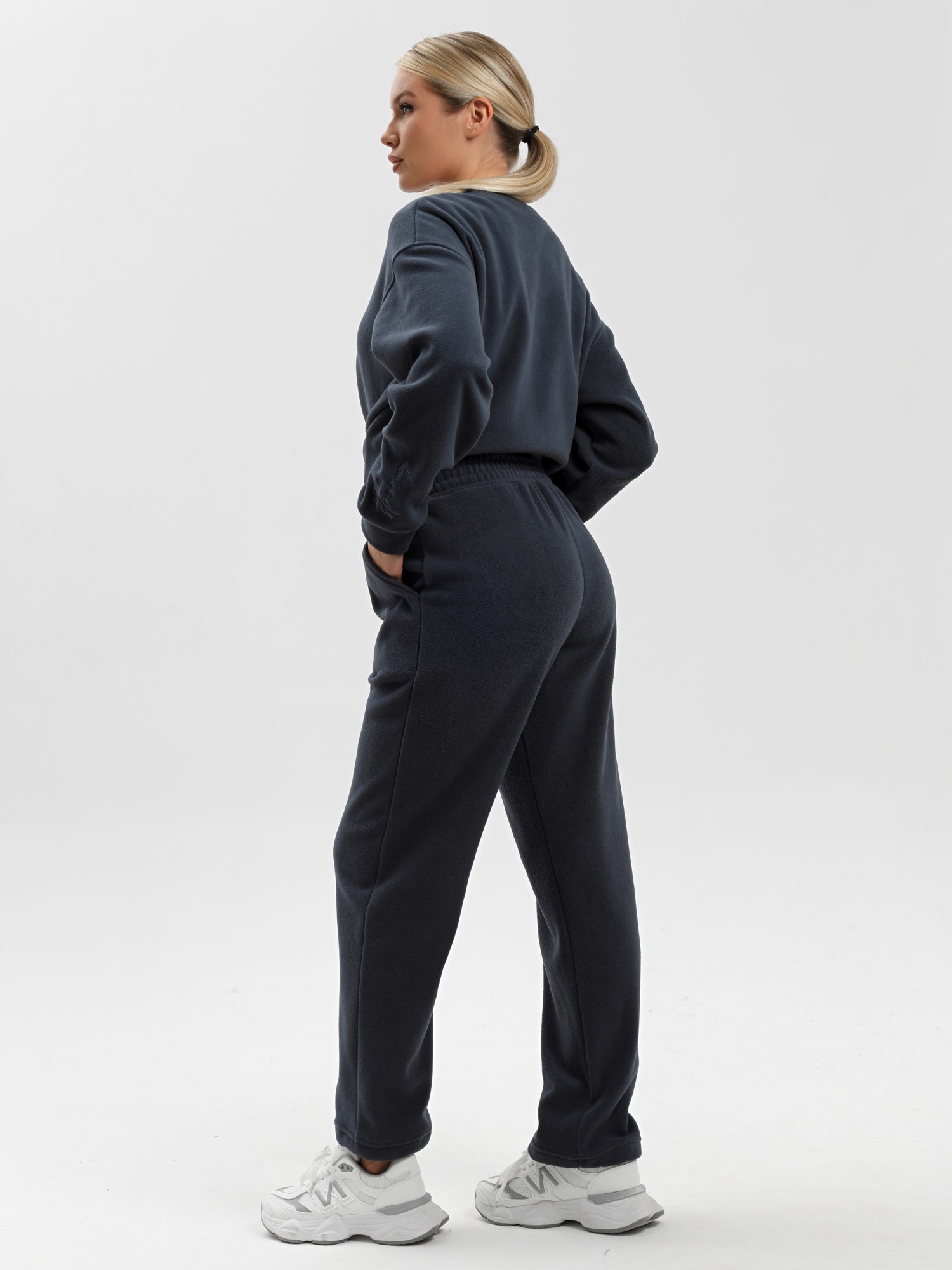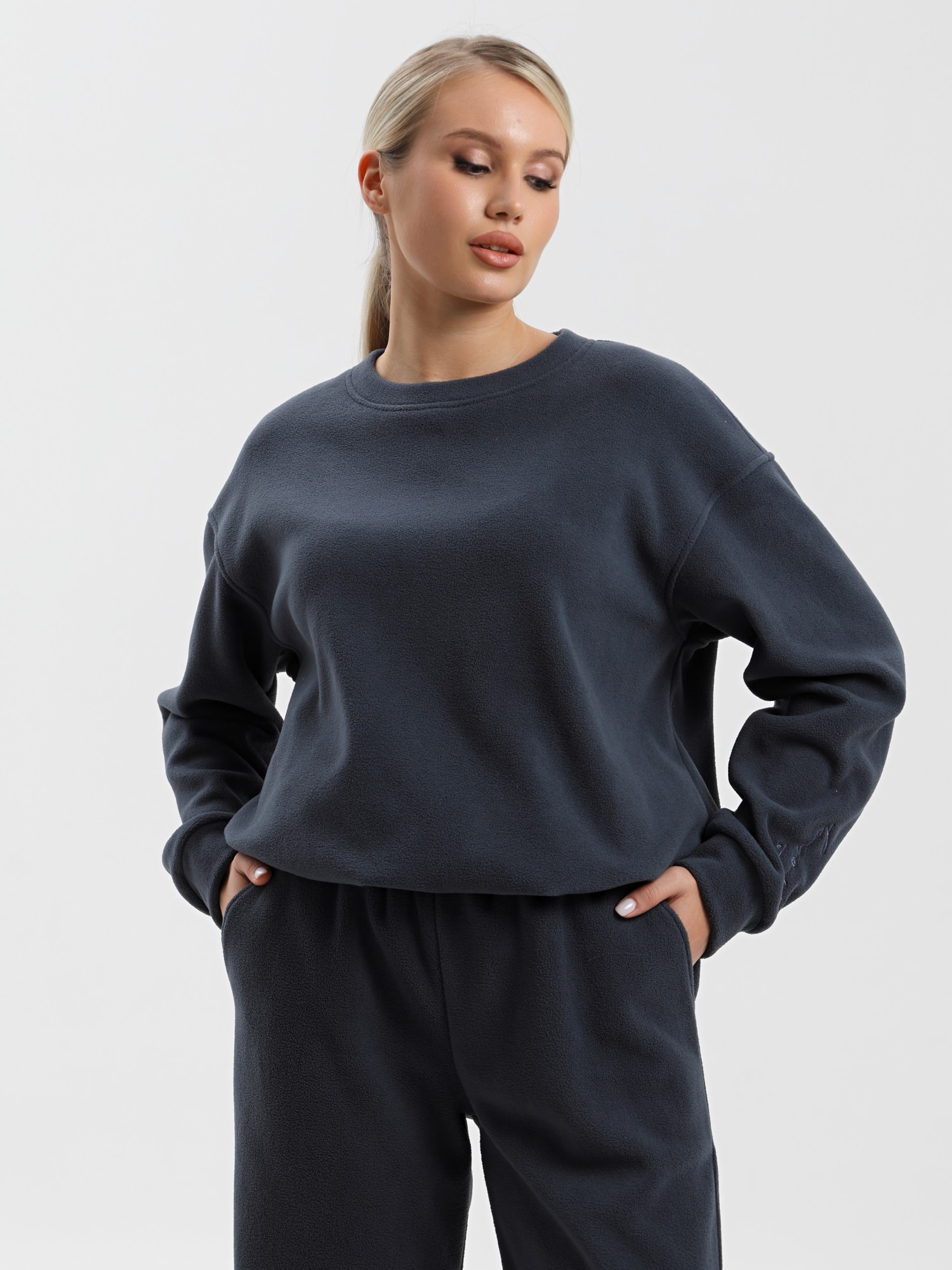 Костюм молодежный из гладкокрашенного полотна «флис», состоящий из джемпера и брюк. Джемпер – прямого силуэта, с длинными втачными рукавами, горловиной овальной формы, обработанной втачной планкой. На левом рукаве выполнена вышивка, низ обработан манжетами. По низу изделия подгибка с вложением эластичной тесьмы, регулируемой по длине фиксаторами.Брюки – длинные, свободные, на притачном поясе с эластичной тесьмой внутри, карманами в боковых швах. Нижние срезы обработаны подгибкой с вложением эластичной тесьмы, регулируемой фиксаторами.