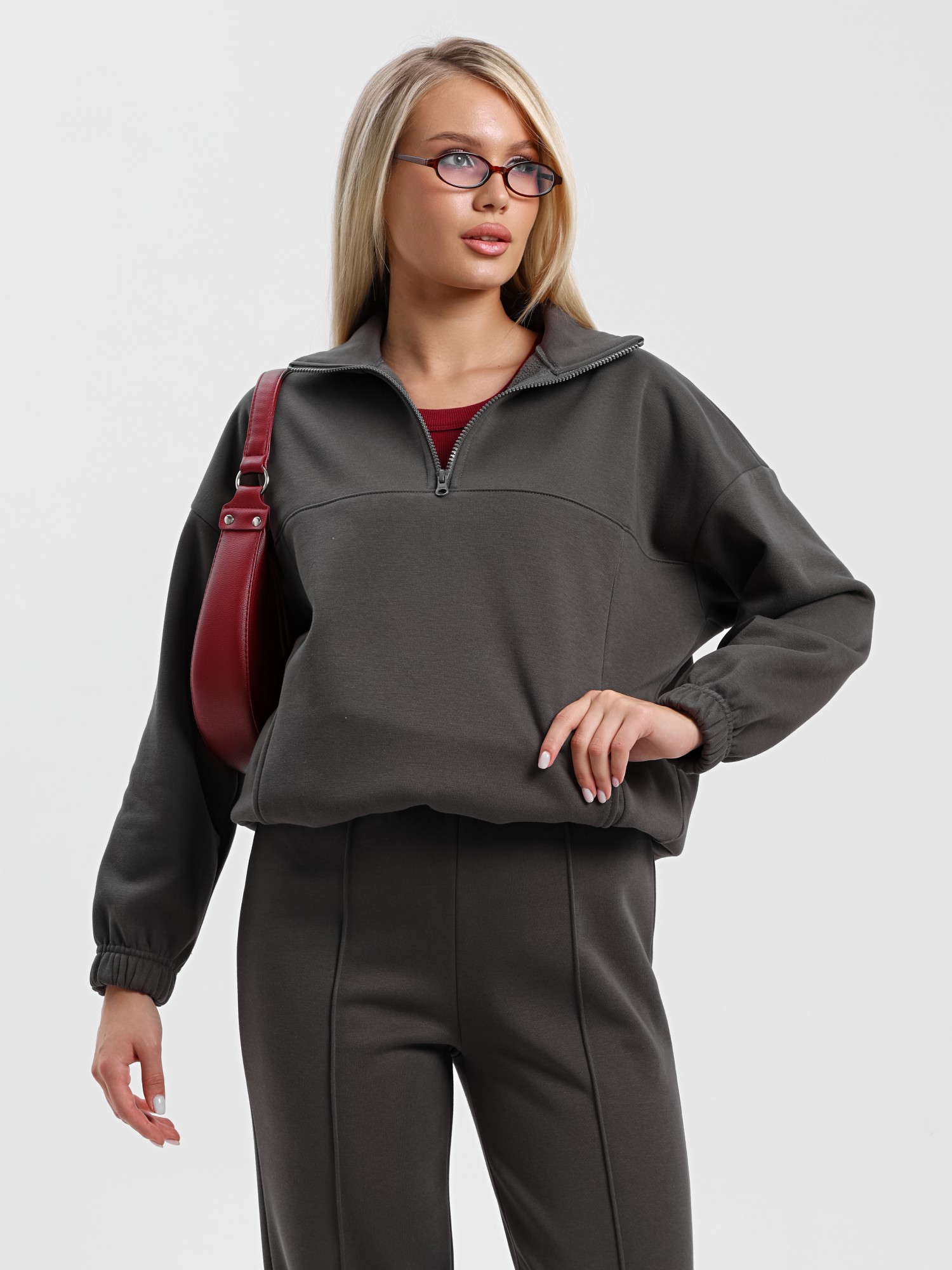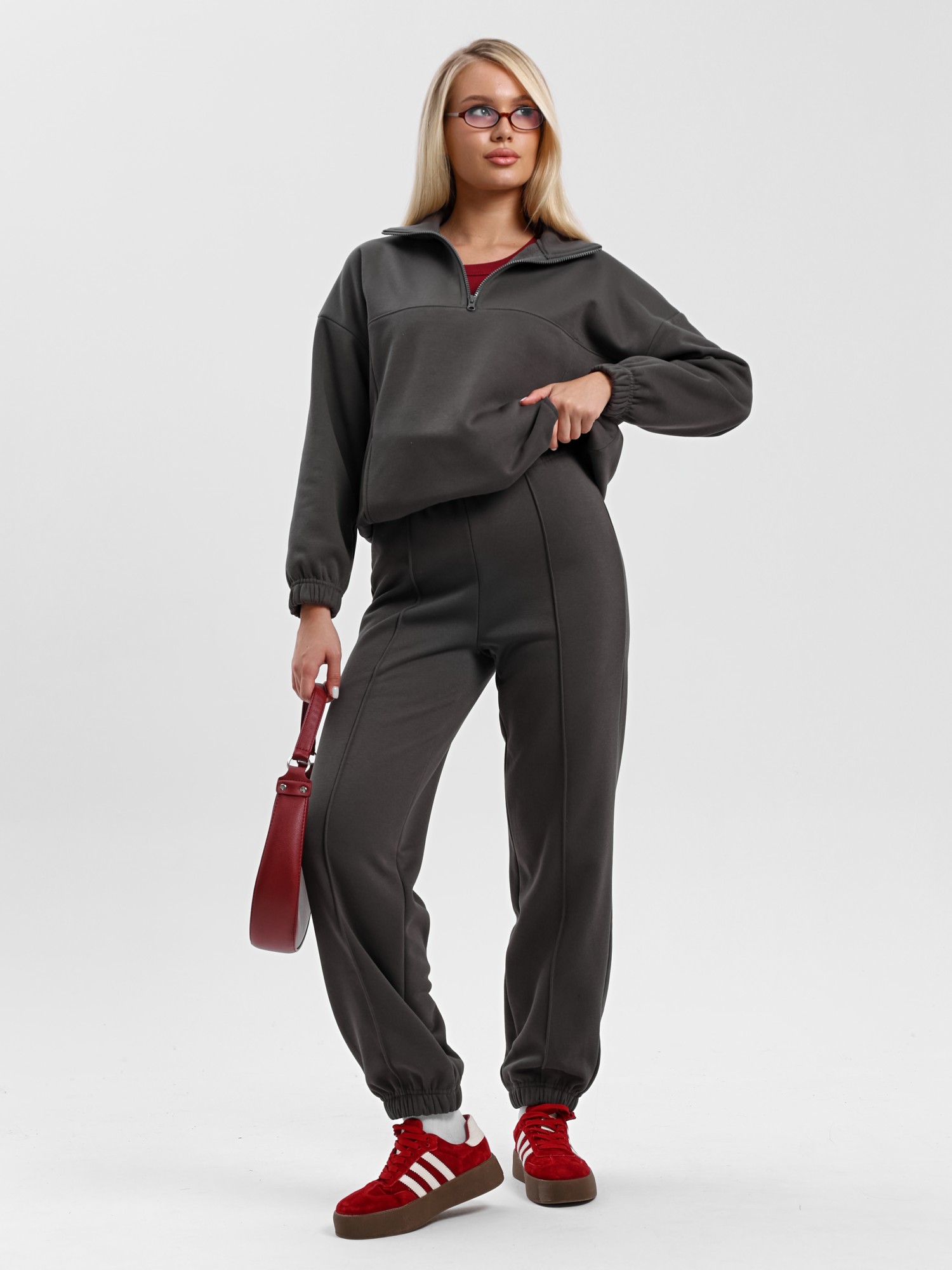 Костюм молодежный из трикотажного гладкокрашенного полотна «еврофлис», Джемпер - свободного покроя, с длинными втачными рукавами, нижние срезы которых обработаны эластичной тесьмой, воротником-стойкой и карманами в рельефных швах. Полочка - с отрезной кокеткой из двух частей, с застежкой "молния", обработанной в соединительном шве. Низ изделия с подгибкой и регулируется по ширине с помощью фиксатора.Брюки – длинные, полуприлегающего силуэта, на поясе с эластичной тесьмой внутри и карманами в боковых швах. Передние половины застрочены по центральным линиям.