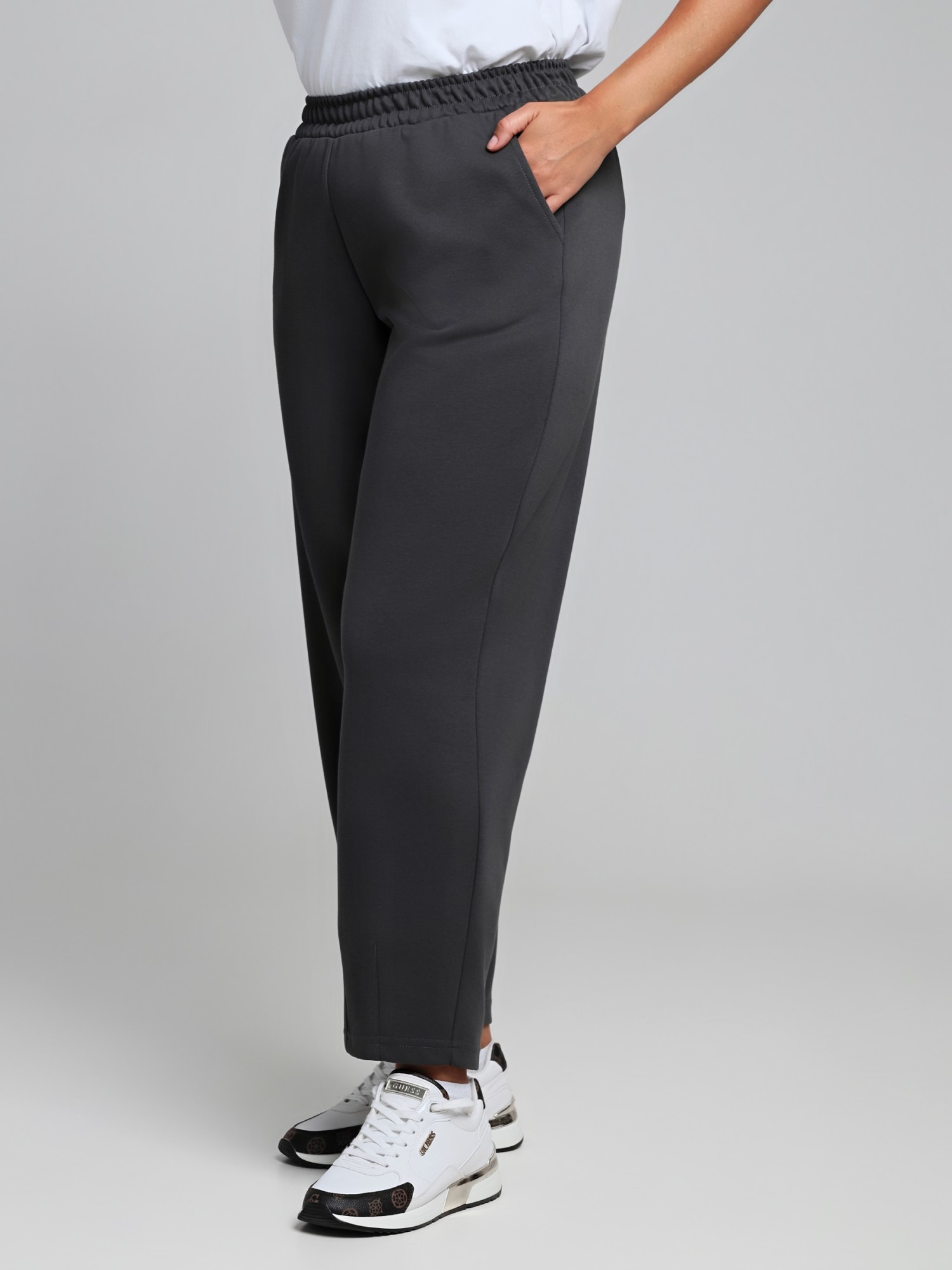 Брюки – укороченные, на притачном поясе с эластичной тесьмой внутри и карманами в боковых швах. На нижних частях передних половин застрочено по две вертикальных складочки-защипа.