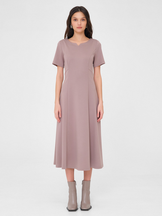Модель с рельефами и наклонными подрезными бочками. Спереди по горловине фигурный вырез. Платье декорировано отделочными строчками. Ремень в комплект не входит.
