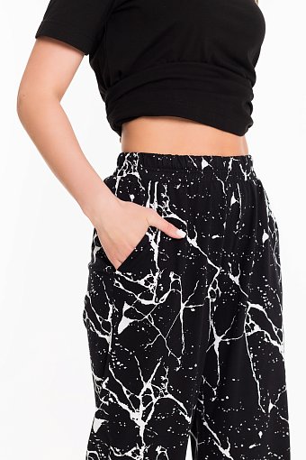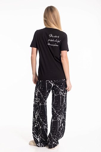 Женский костюм - футболка и брюки свободного кроя из кулирки. Футболка с короткими рукавами и круглым вырезом горловины украшена принтом сзади. Брюки свободные, пояс на широкой резинке, а по бокам есть карманы. Такой наряд подойдёт для повседневной носки, прогулок или неформальных встреч. Костюм обеспечит комфорт и свободу движений благодаря свободному крою и натуральным материалам.