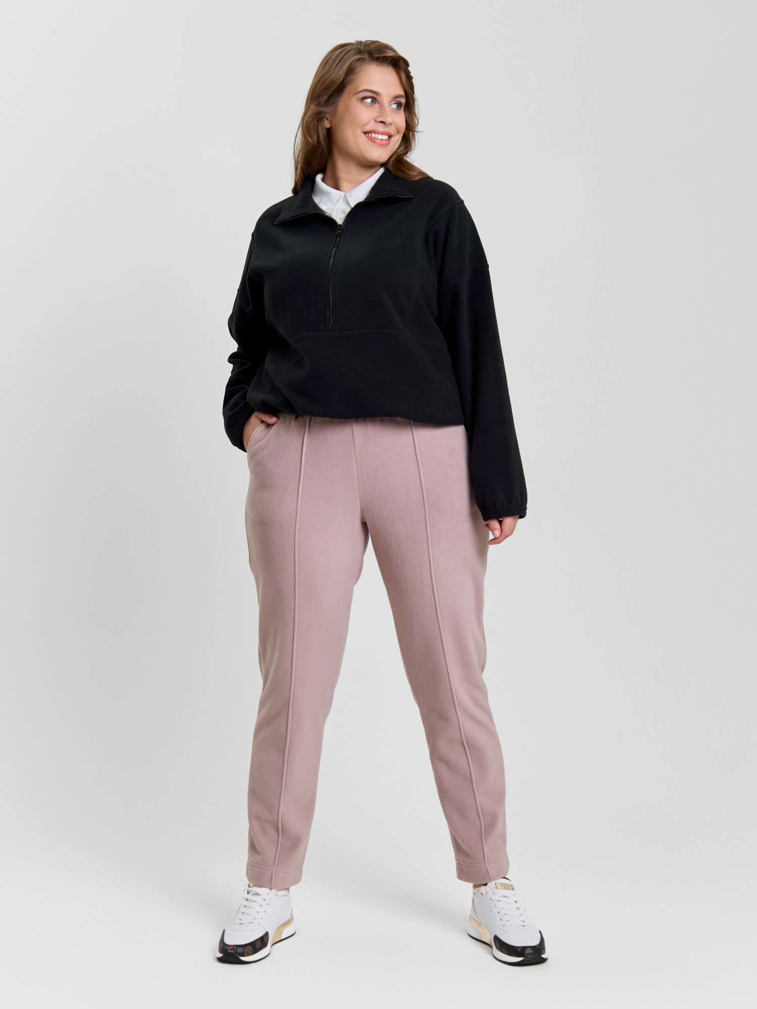 Брюки женские из гладкокрашенного трикотажного полотна «флис», длинные, полуприлегающего силуэта, на притачном поясе с эластичной тесьмой внутри и карманами в боковых швах. Передние половины застрочены по центральным линиям, низ обработан широкой подгибкой.