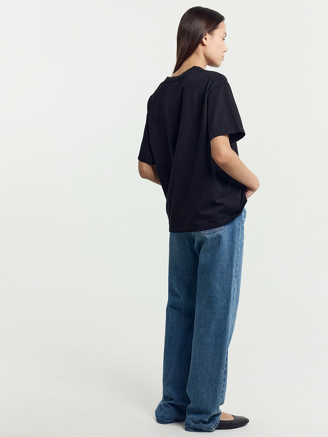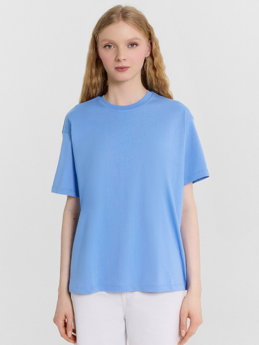Хлопковая футболка свободного силуэта из трикотажной кулирки. Вырез круглой формы. Свободу движений гарантируют спущенная линия плеча и углубленная пройма. Рукава широкие, чуть выше локтя. Стильная модель!