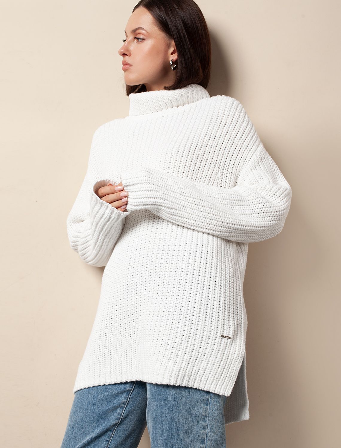 Свободный свитер с высоким воротником белоснежного оттенка. Модель со спущенной линией плеч выполнили крупной фактурной вязкой из мягкого хлопка с акрилом Изделие из такой пряжи получилось невероятно теплым и приятным на ощупь. Подходит для любого типа фигуры.