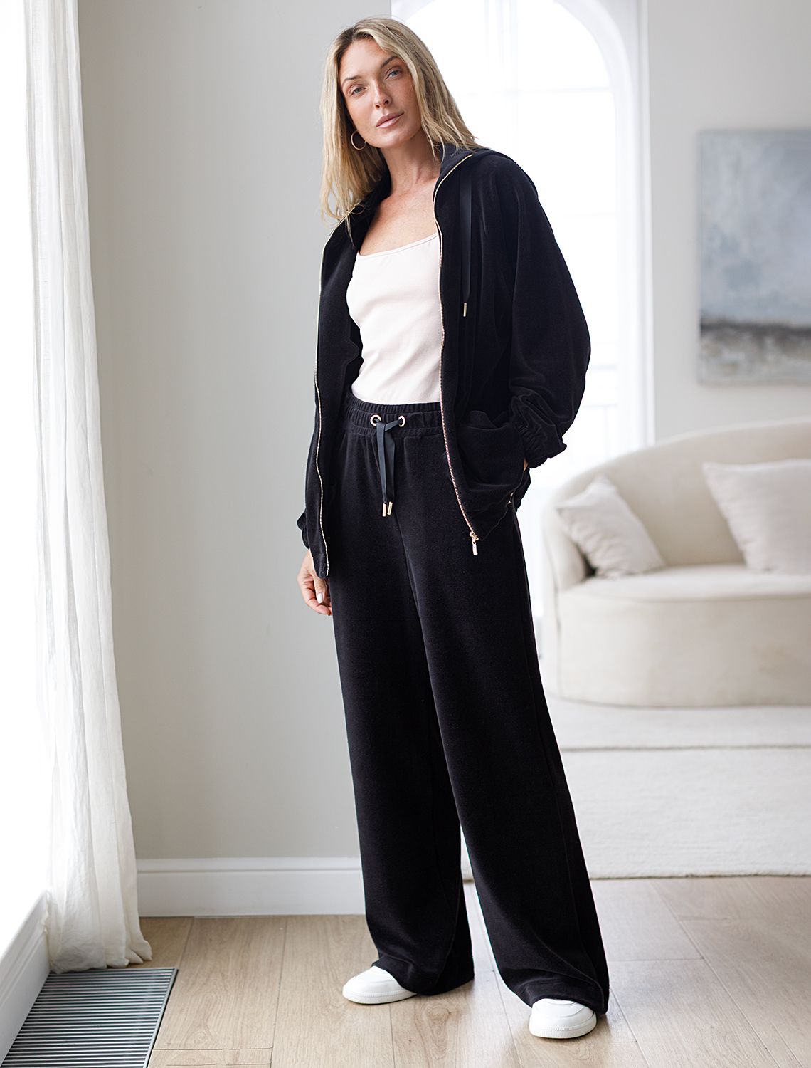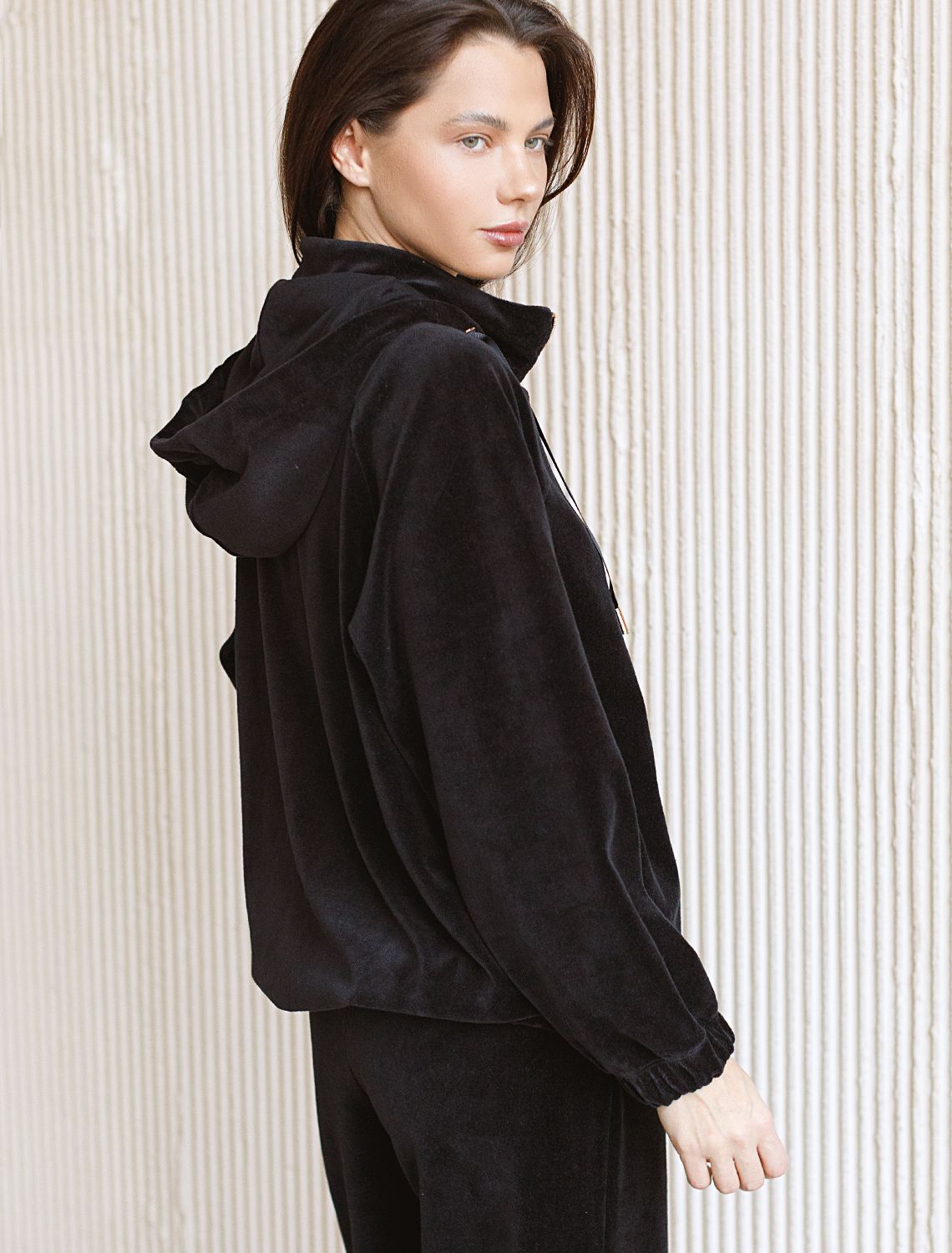 Худи на двухсторонней молнии выполнено из бархатистого велюра. Модель дополнена резинкой по низу и боковыми карманами. Легкий и мягкий материал с матовой фактурой придает изделию нежность и комфорт. Хорошо держит тепло и форму – идеальное решение для домашнего отдыха. Сочетается в костюме с брюками D44.117