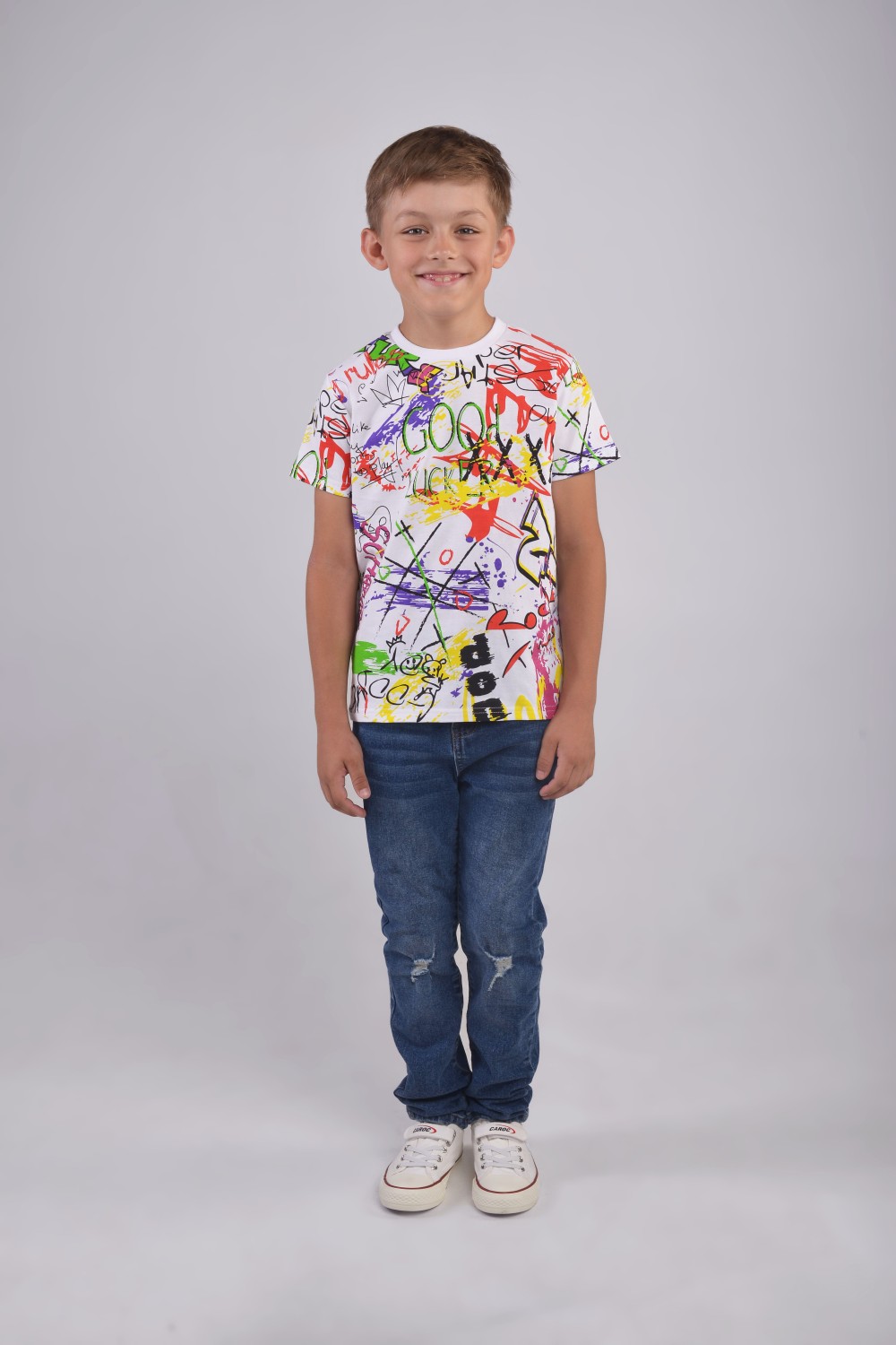 Футболка для мальчика подростка белая, свободного классического кроя, классической длины, модная, стильная, нарядная, из качественного мягкого хлопкового полотна 170 г/м2 с принтом, выполненным в технологии water print (вотер принт) - нанесение рисунка безопасными сертифицированными красителями на водной основе, что позволяет изделию оставаться мягким, тонким и эластичным, долго сохранять яркость. Модная футболка с ярким рисунком в стиле граффити - выбор современных подростков и мальчика-модели на фотосессии. Модель - 9 лет, рост 137 см, размер футболки на мальчике - 134-140 см