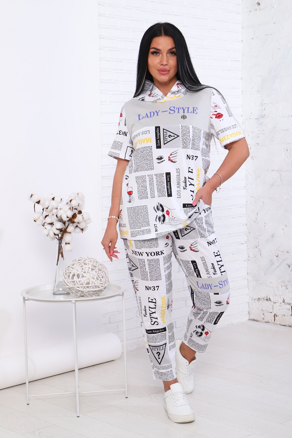 Костюм женский: футболка свободного силуэта с капюшоном, с короткими рукавами и с принтом на полочке, брюки с боковыми карманами и с небольшим принтом на левой штанине спереди. Комфорт 100% хлопка, удобная посадка.