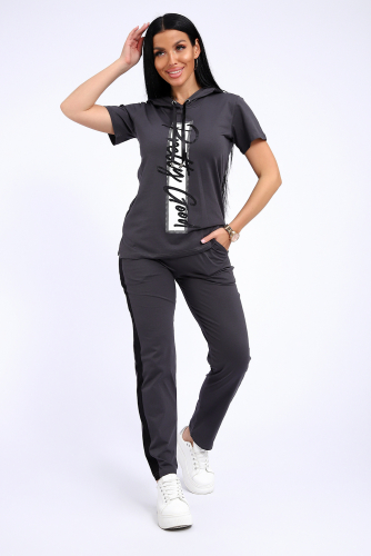 Костюм женский трикотажный: толстовка с капюшоном, карман Кенгуру, спинка немного длиннее полочки, спущенное плечо, трендовый высокий манжет у рукавов; брюки бананы на широком эластичном поясе, с боковыми карманами.