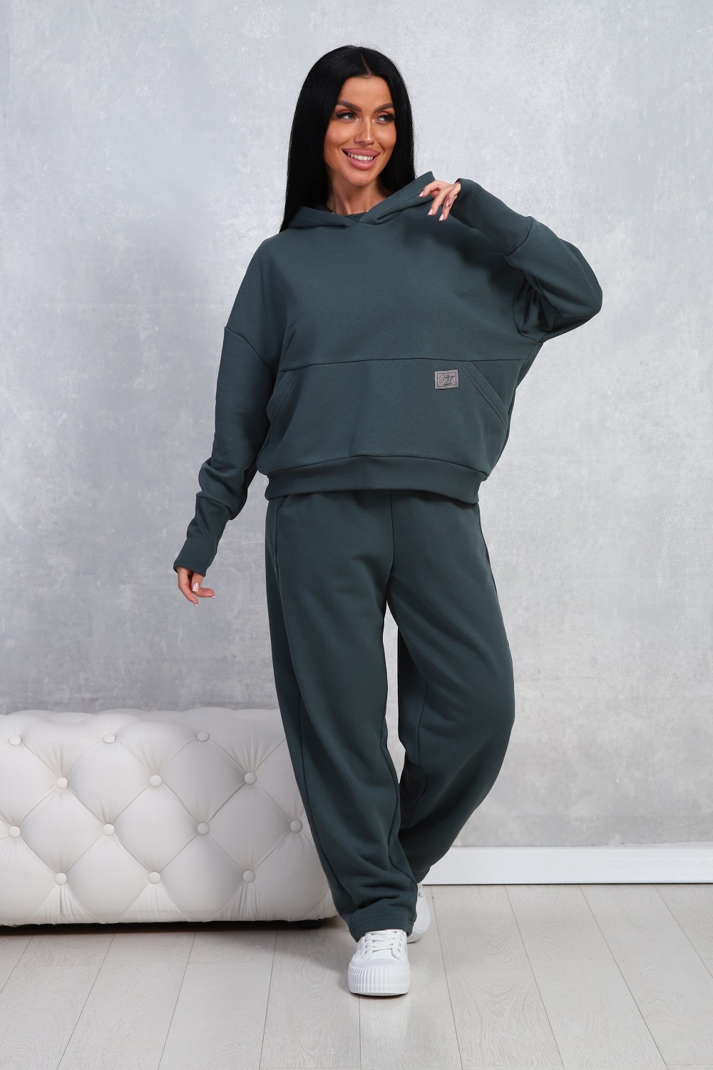 Костюм женский трикотажный: толстовка с капюшоном, карман Кенгуру, спинка немного длиннее полочки, спущенное плечо, трендовый высокий манжет у рукавов; брюки бананы на широком эластичном поясе, с боковыми карманами. Цвет: антрацит; Материал: футер 3-х нитка;футер 3-х нитка; Состав: 88% ХБ, 12% ПЭ.