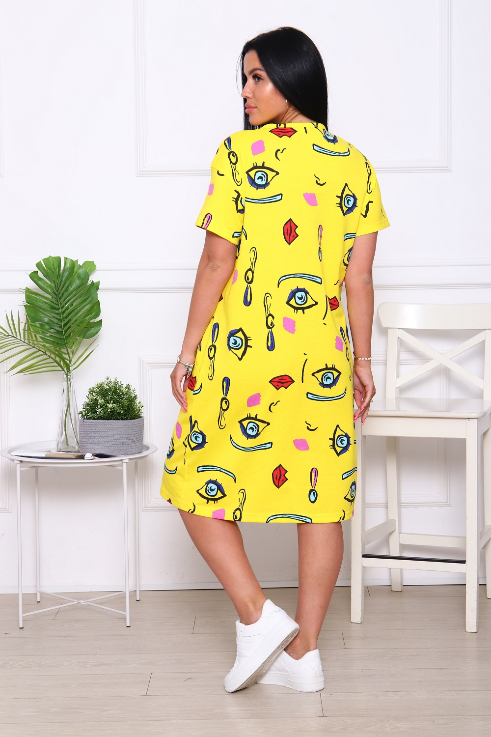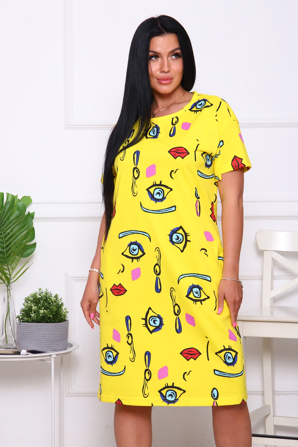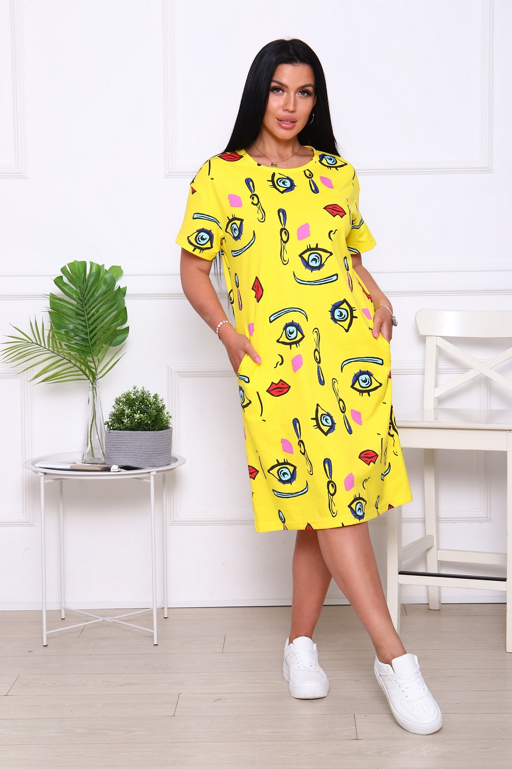 Туника- платье женская с короткими рукавами и боковыми карманами. Яркая модель для лета. Цвет: желтый; Материал: кулирка;кулирка; Состав: 100% Хб.