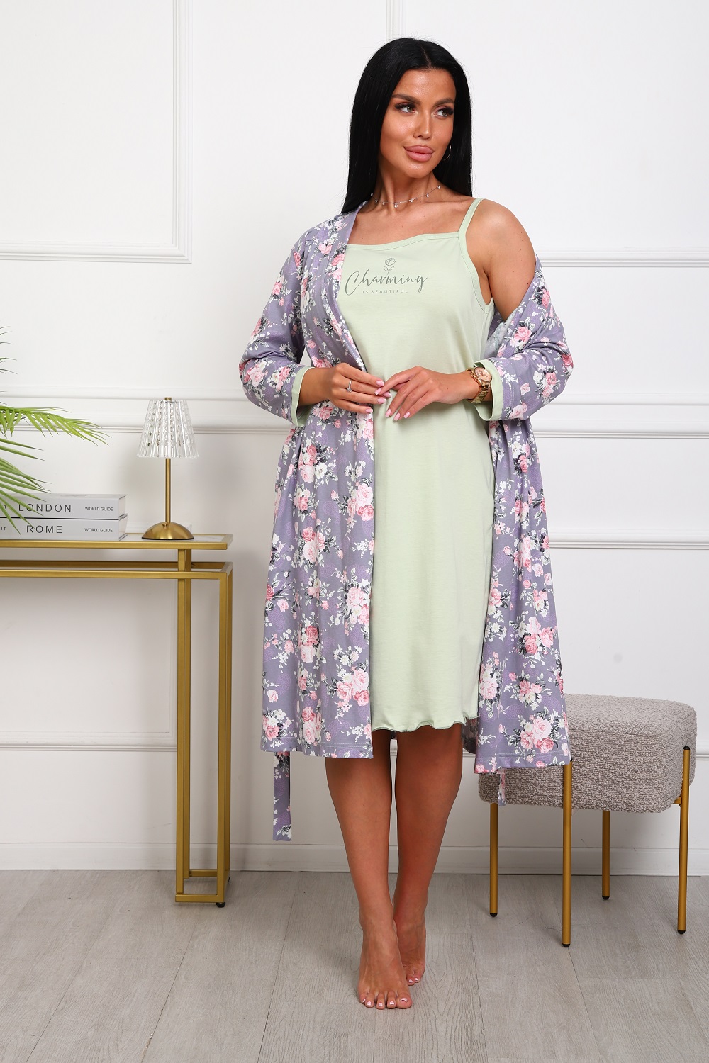 Пеньюар с сорочкой на тонких бретелях. Пеньюар запашной, с боковыми карманами, с поясом. Комфорт 100%-ого хлопка и удобная посадка изделий. Женственный нежный принт пеньюара и лаконичный принт на сорочке создают стильный и уютный образ.
