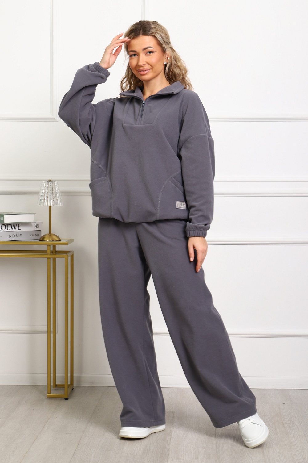 Костюм женский свободного силуэта: брюки широкие на эластичном поясе, с боковыми карманами; толстовка с воротником-стойкой на молнии, с оригинальными карманами, манжеты на резинке. Комфорт и тепло 100% флиса.
