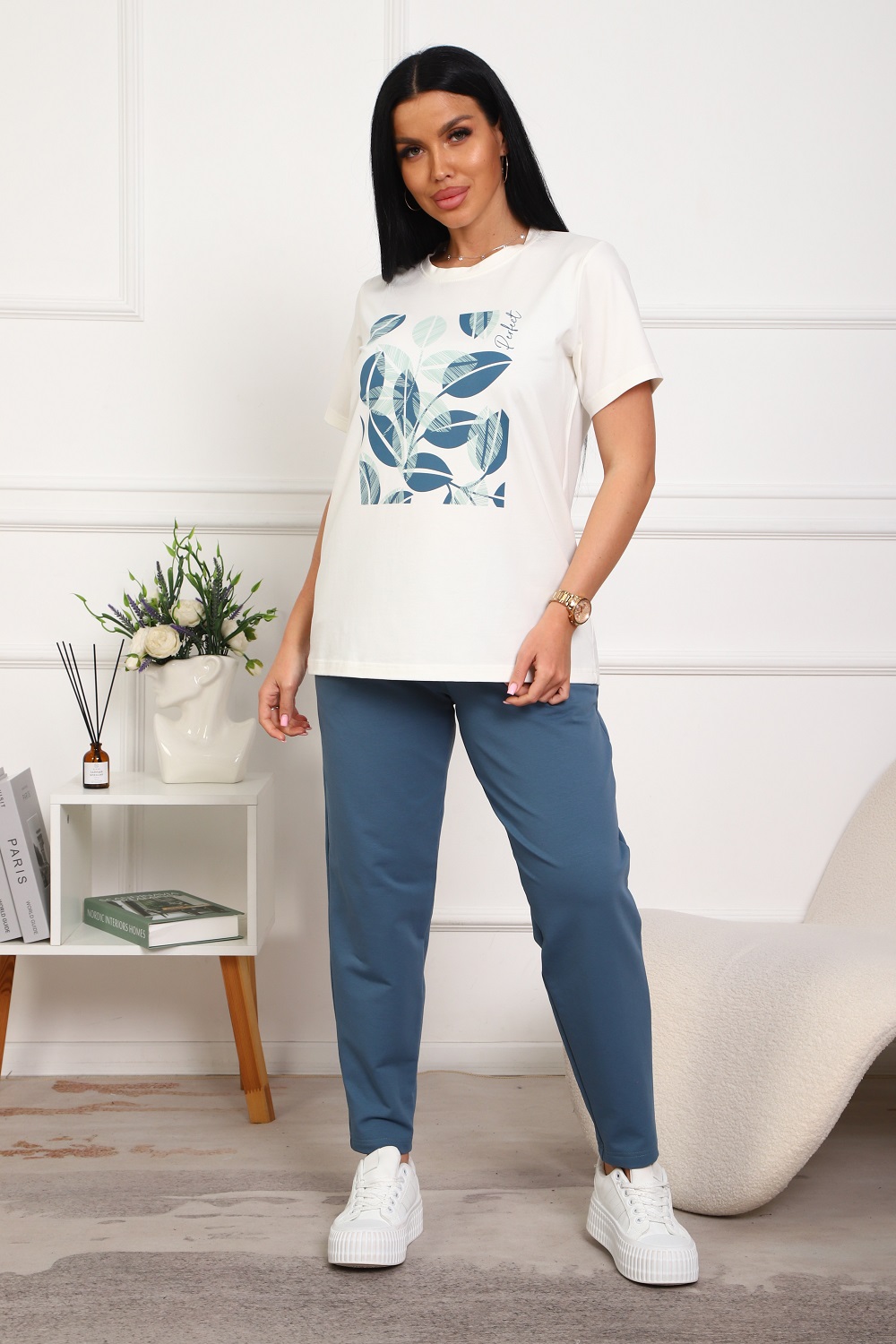 Костюм женский: футболка с короткими рукавами и бриджи с боковыми карманами. Цвет: экрю;голубой; Материал: кулирка;футер 2-х нитка;футер 2-х нитка;кулирка; Состав: ХБ 95%, лайкра 5% и 74% ХБ, 21% ПЭ, 5% лайкра.