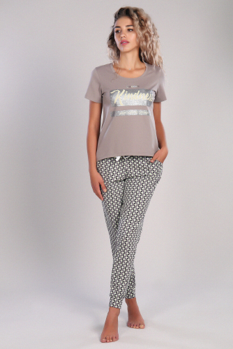 Костюм женский: футболка умеренного объема, удлинённая, прямого силуэта, горловина круглая. Брюки среднего объема, с посадкой на талии. Брюки слегка заужены к низу. По бокам карманы с цельнокроенным бочком.