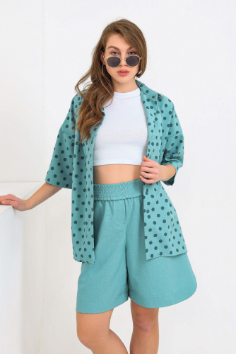 Костюм женский: шорты с боковыми карманами, на поясе и футболка классическая с короткими рукавами и стильным принтом на груди. Трикотаж отличного качества подарит комфорт и презентабельный вид.
