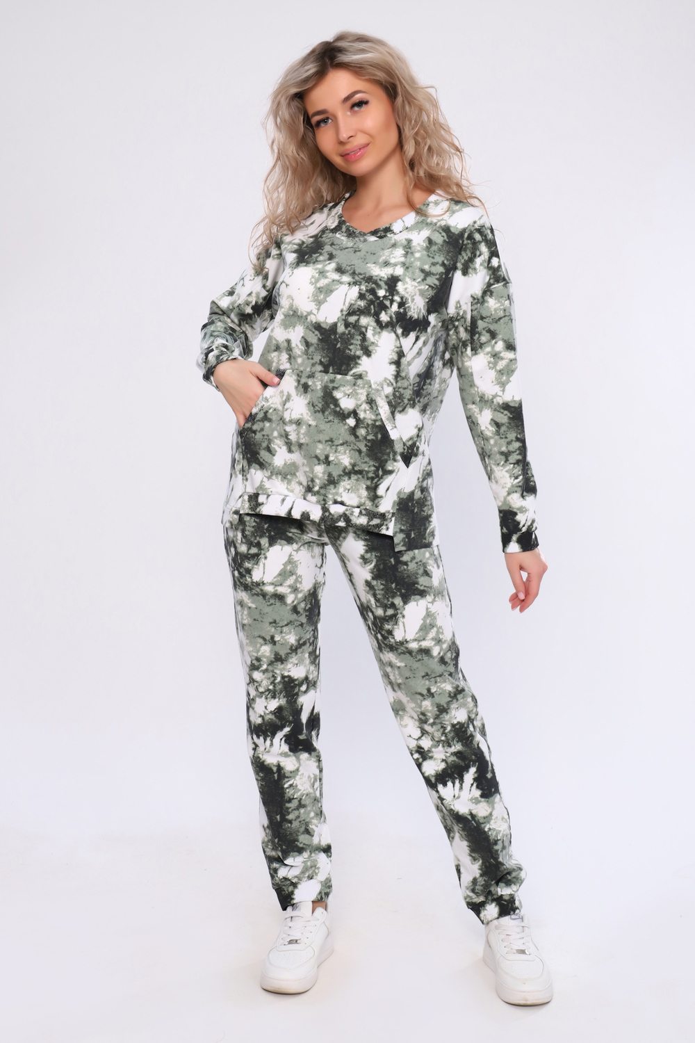 Спортивный женский костюм представляет собой демисезонный трикотажный комплект, состоящий из двух элементов: толстовка и брюки джогеры. Свободная толстовка без капюшона имеет длинные рукава (длина рукава указана от горловины) V-образную горловину и карман кенгуру. Брюки джоггеры приятно облегают фигуру, но не сковывают движения. Модель позволяет носить костюм двойка как вместе, так и по отдельности, что дает возможность создавать различные образы. Сочетание универсального современного дизайна и качественного материала делают костюм отличным решением для повседневной носки в любое время года, особенно осенью. Модный базовый набор подойдет для женщин, девушек любого роста: высоких и невысоких. Хорошо смотрится на разных типах фигуры. Комплект без начеса и утепления не только многофункционален, но и практичен. Его выбирают для прогулок на свежем воздухе, похода, туризма и для других видов активного отдыха.