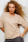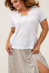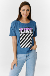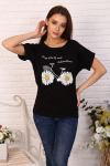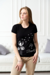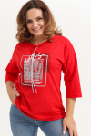 Футболка для женщин, прямого силуэта. Рукав втачной, короткий. Горловина округлая. Полочка изделия с асимметричным вертикальным резом и буквенным принтом.