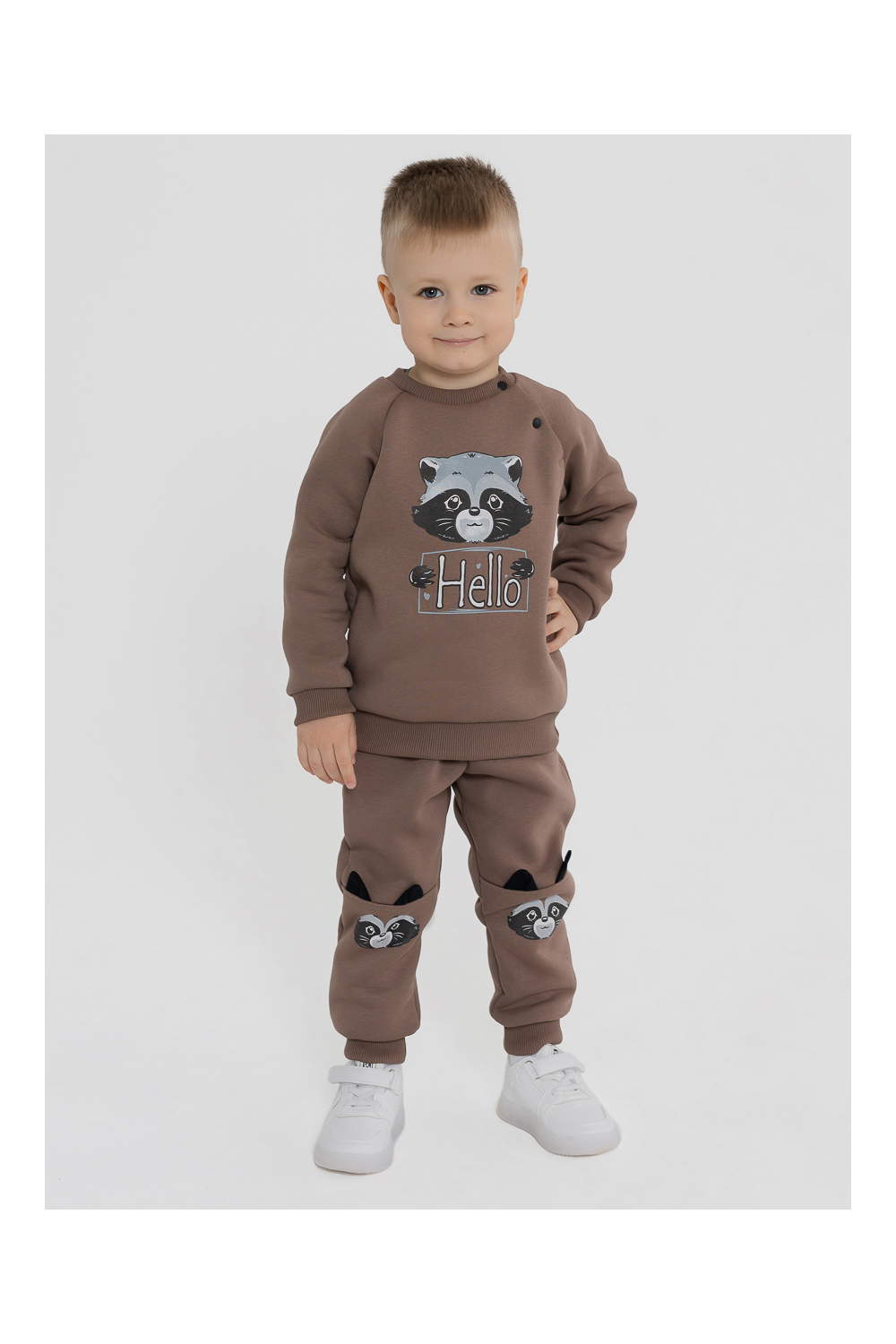 Толстовка Енот для мальчика, предназначена для носки в прохладных помещениях и прогулки на улице, выполнена из мягкого футера с начёсом. Толстовка на эластичном поясе, рукава покроя реглан на манжетах, застёжка по шву рукава-реглан на клёпки. Принт, нанесённый методом шелкографии на ткани.