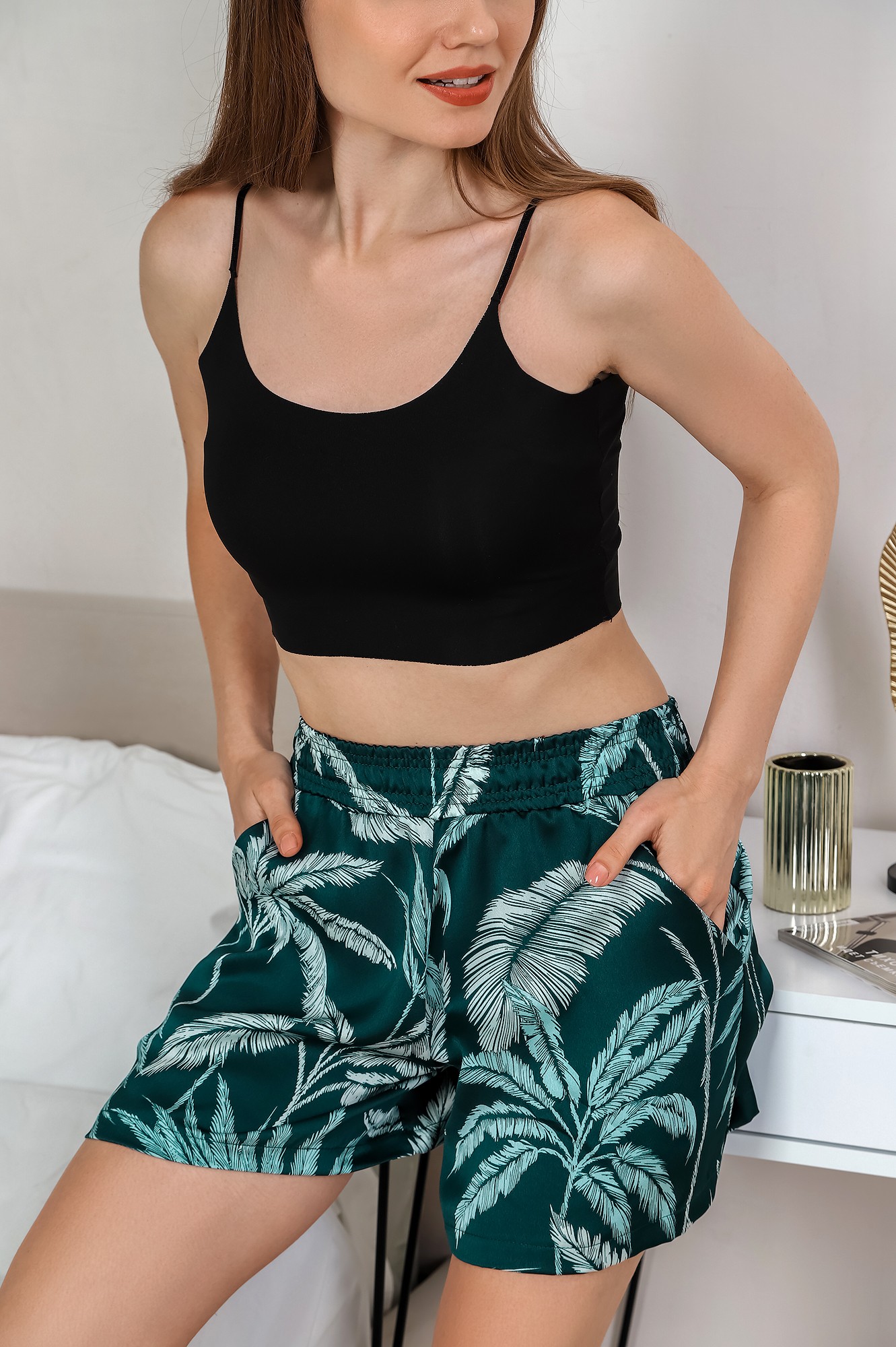 Шорты - женские из тканого синтетического полотна с набивным рисунком, укороченные свободного покроя, с карманами в боковых швах, на притачном поясе с эластичной тесьмой внутри.