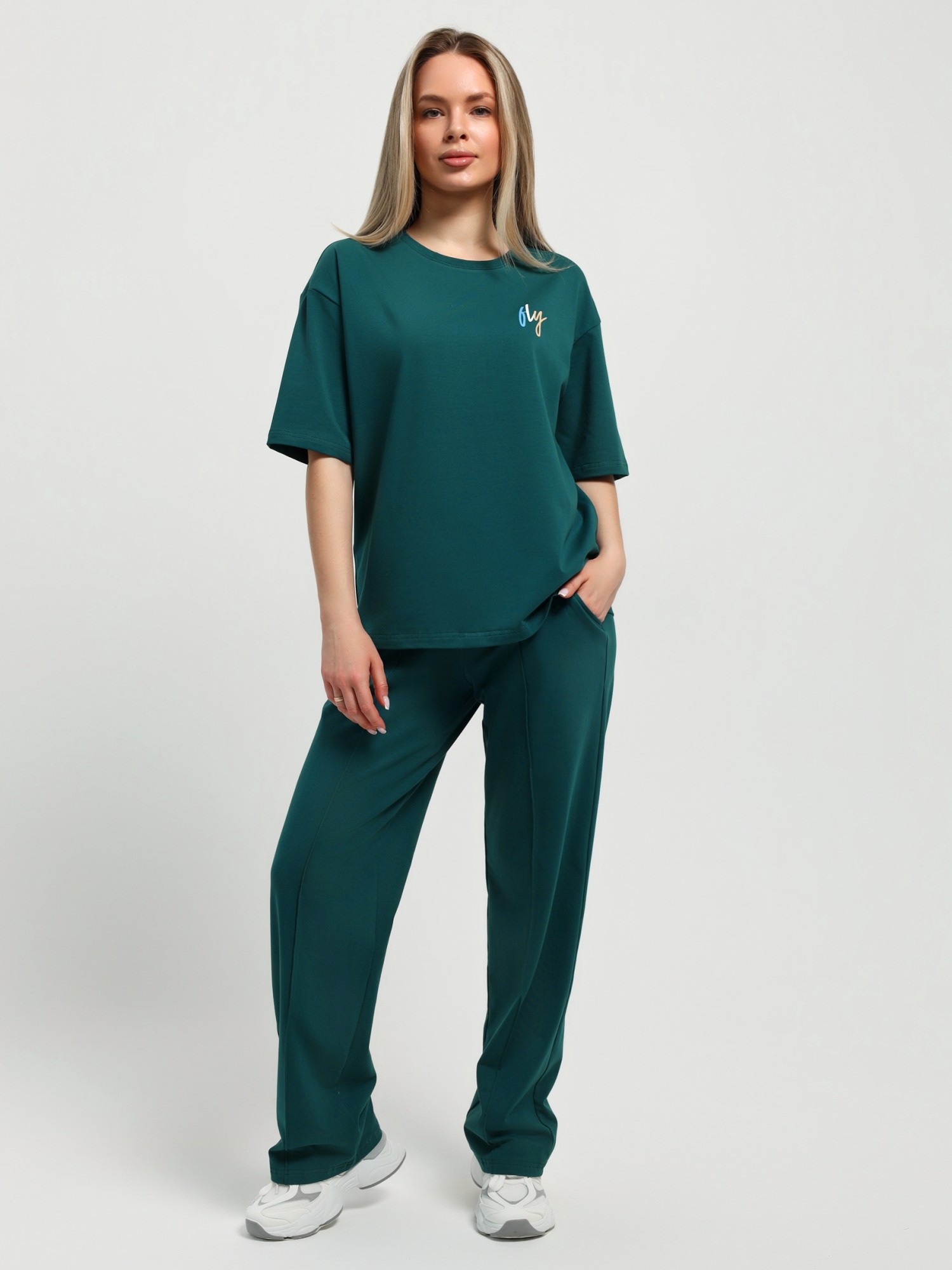 Костюм женский из гладкокрашеного трикотажного полотна "кулирка с лайкрой" состоящий из футболки и брюк. Футболка – классического покроя, с короткими втачными рукавами и горловиной овальной формы, обработанной втачной планкой, на полочке выполнен принт в технике "шелкографии".Брюки – длинные, классического кроя, на притачном поясе с эластичной тесьмой внутри и карманами в боковых швах. Передние половины брюк застрочены по центральным линиям. По центру пояса настрочен декоративный элемент.