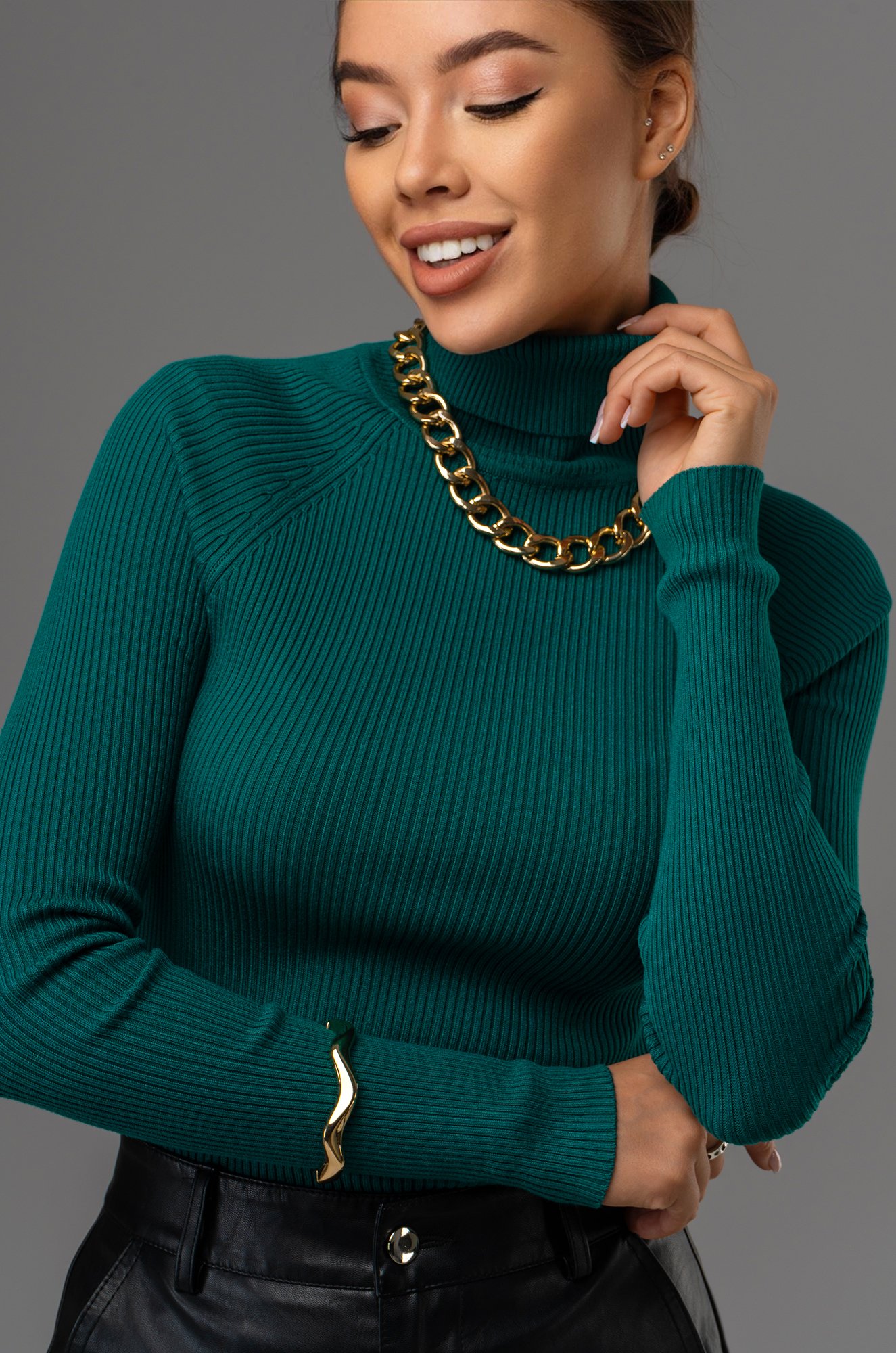Однотонный бадлон изумрудного цвета для женщин станет незаменимой частью капсульного гардероба: облегающая водолазка одинаково хорошо смотрится в строгом офисном образе и в расслабленном смарт кэжуал стиле.