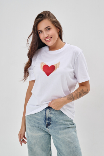 Женская футболка элегантного приталенного кроя с короткими рукавами и классическим круглым вырезом горловины. Минималистичный дизайн дополнен нежными маленькими принтами в форме сердец с леопардовым узором, создающими тонкий акцент на образ. Материал приятен к телу, обеспечивает комфорт и свободу движений. Идеально подойдет для повседневного стиля, подчеркивая женственность и утонченность облика обладательницы.