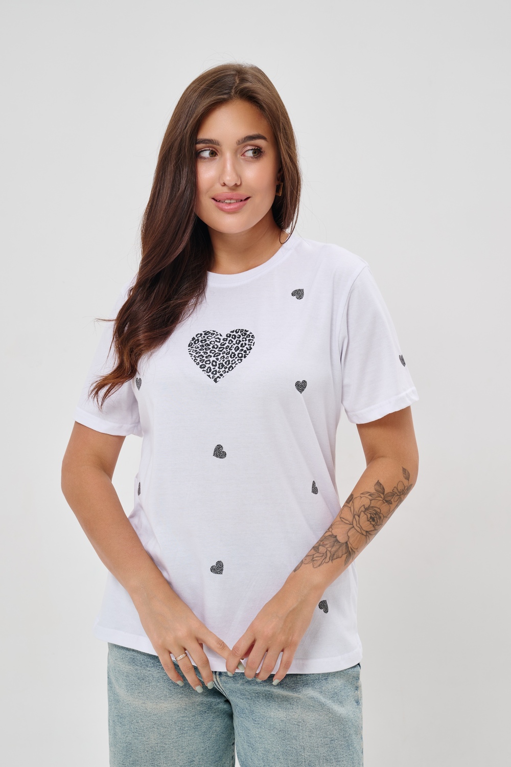 Женская футболка элегантного приталенного кроя с короткими рукавами и классическим круглым вырезом горловины. Минималистичный дизайн дополнен нежными маленькими принтами в форме сердец с леопардовым узором, создающими тонкий акцент на образ. Материал приятен к телу, обеспечивает комфорт и свободу движений. Идеально подойдет для повседневного стиля, подчеркивая женственность и утонченность облика обладательницы.