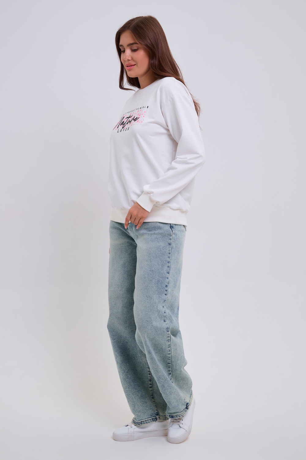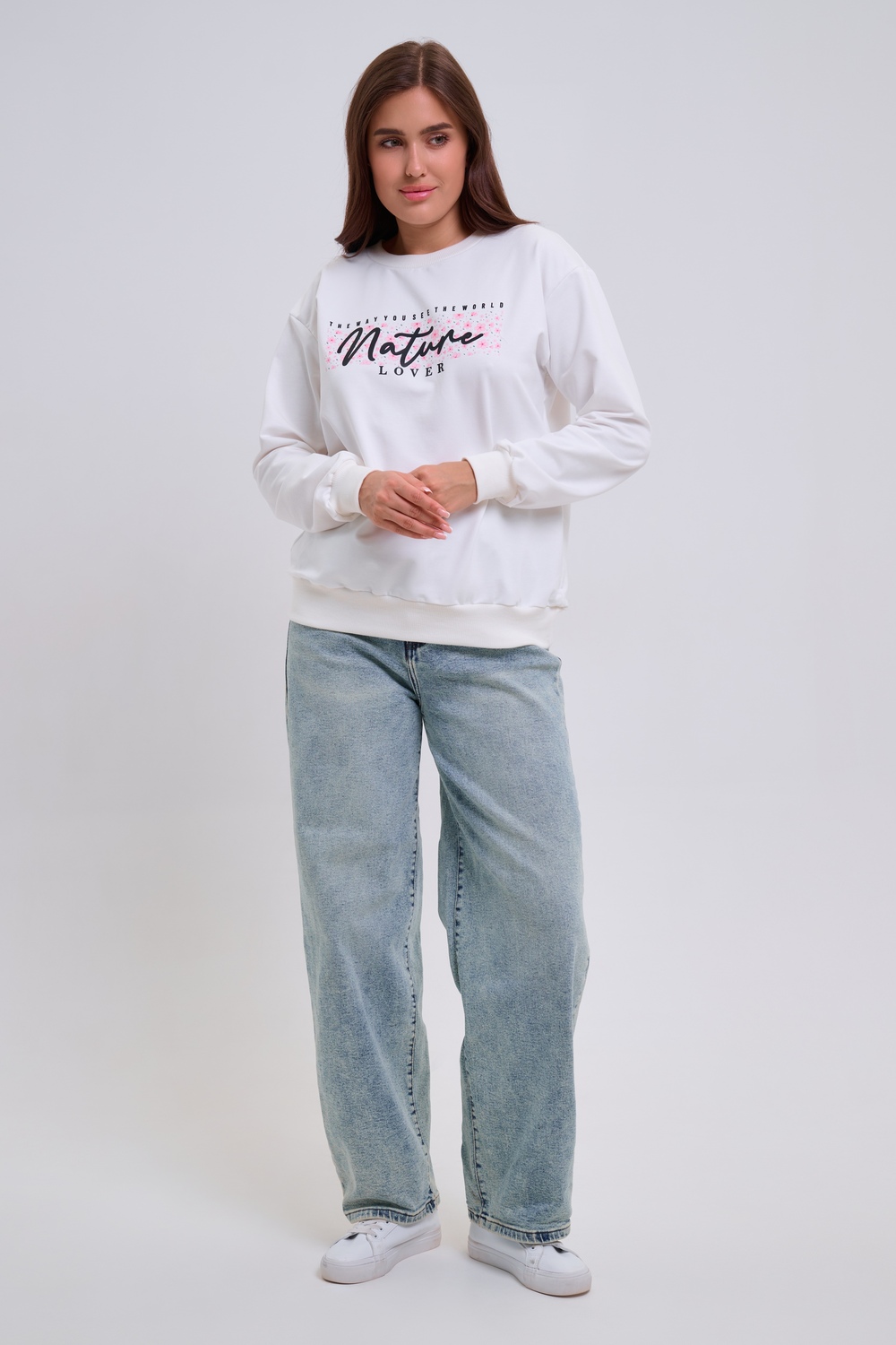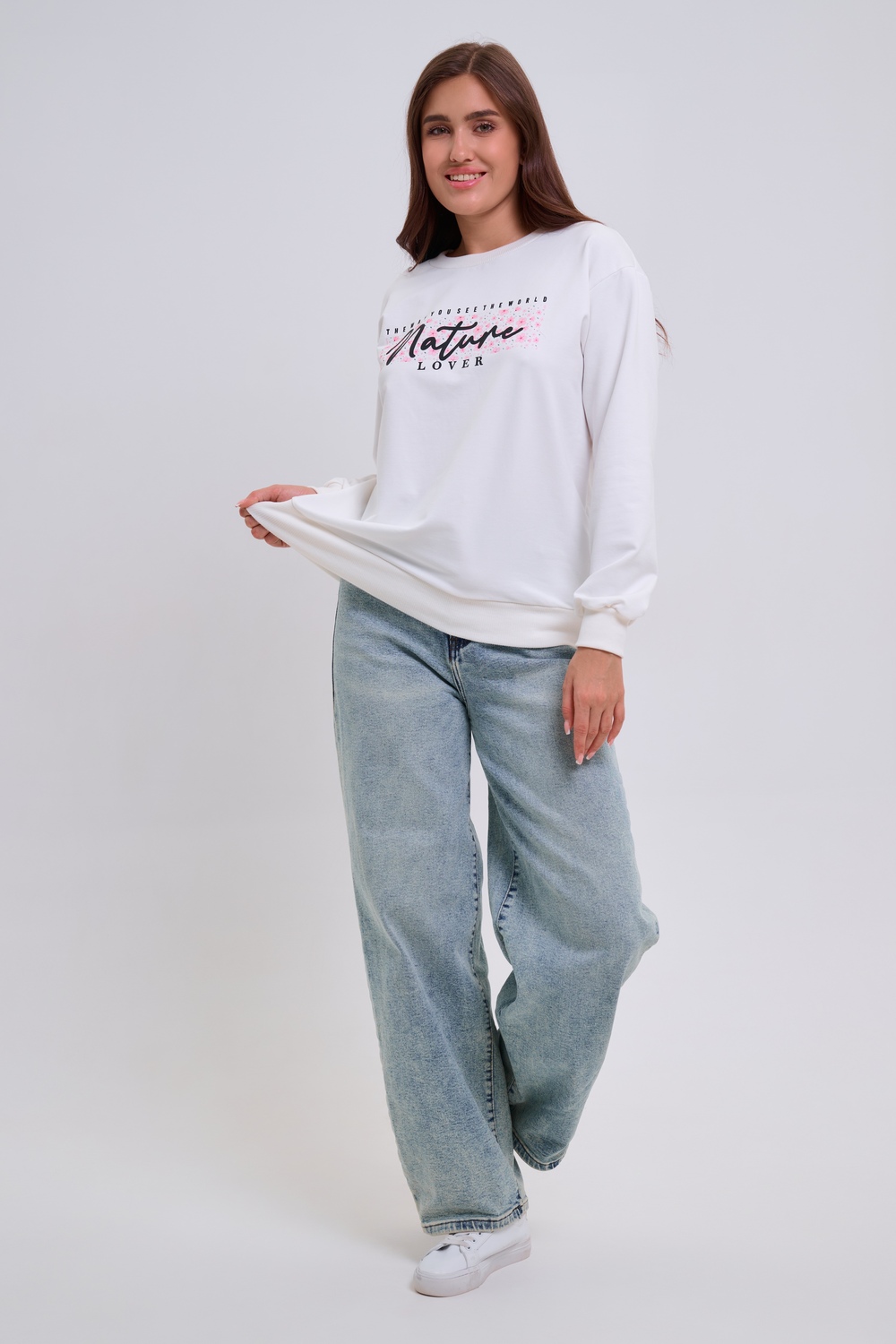 Женский свитшот свободного прямого кроя с круглой горловиной и слегка приспущенными плечами. Спереди нанесён принт в виде надписи NATURE. Выполнен из мягкого и приятного материала футера 2-х нитки, обеспечивающего дополнительный комфорт и сохранение тепла даже в холодную погоду. Доступен в сдвоенных размерах, что удобно для подбора идеальной посадки. Подходит как для повседневной носки, так и для создания эффектных образов в любом стиле. Цвет: молочный; Материал: футер 2-х нитка;футер 2-х нитка; Состав: 95% Хлопок, 5% П/Э.