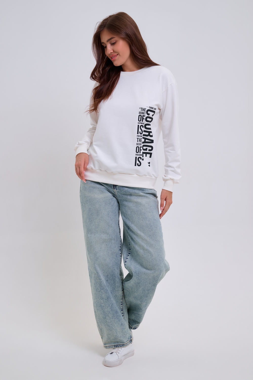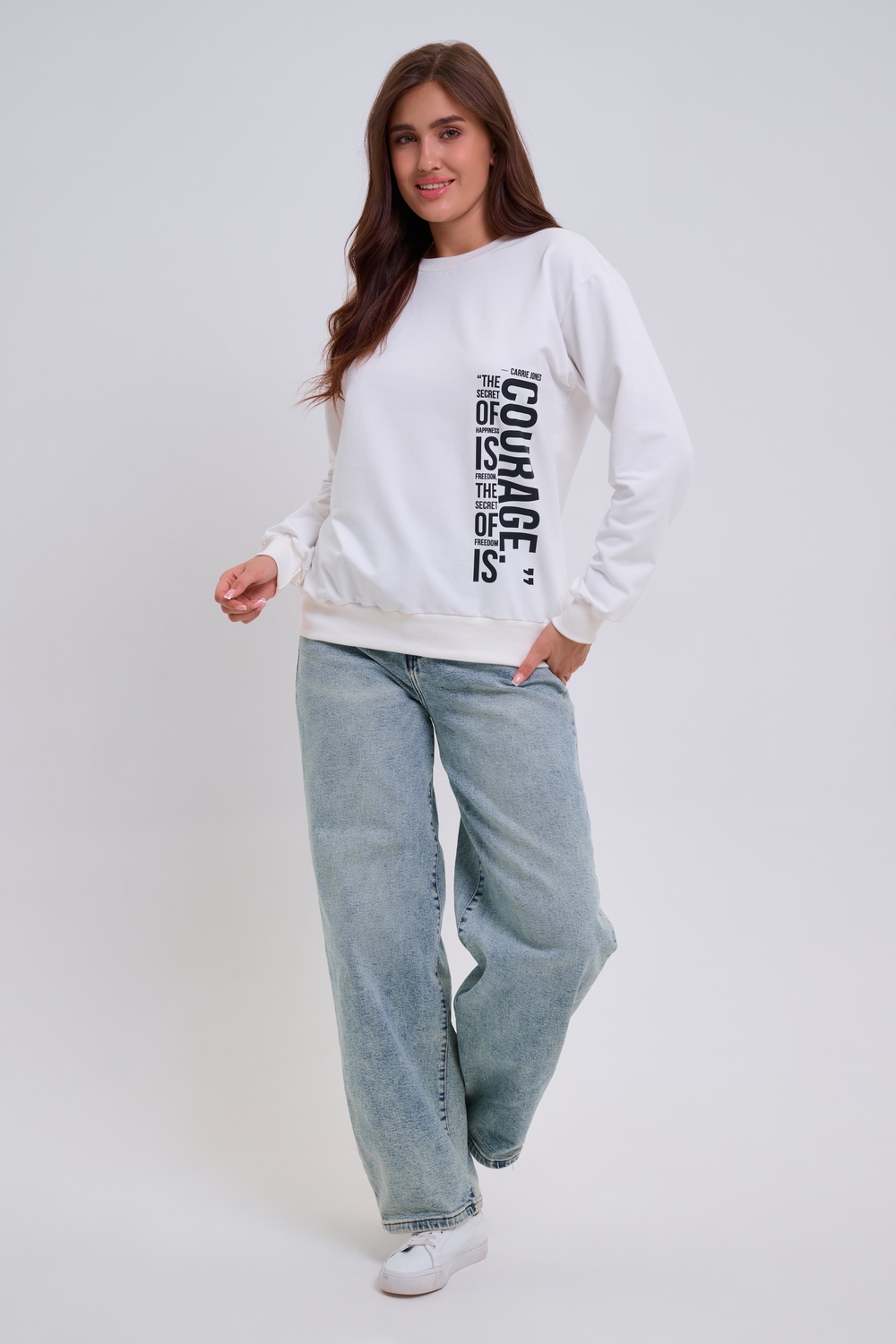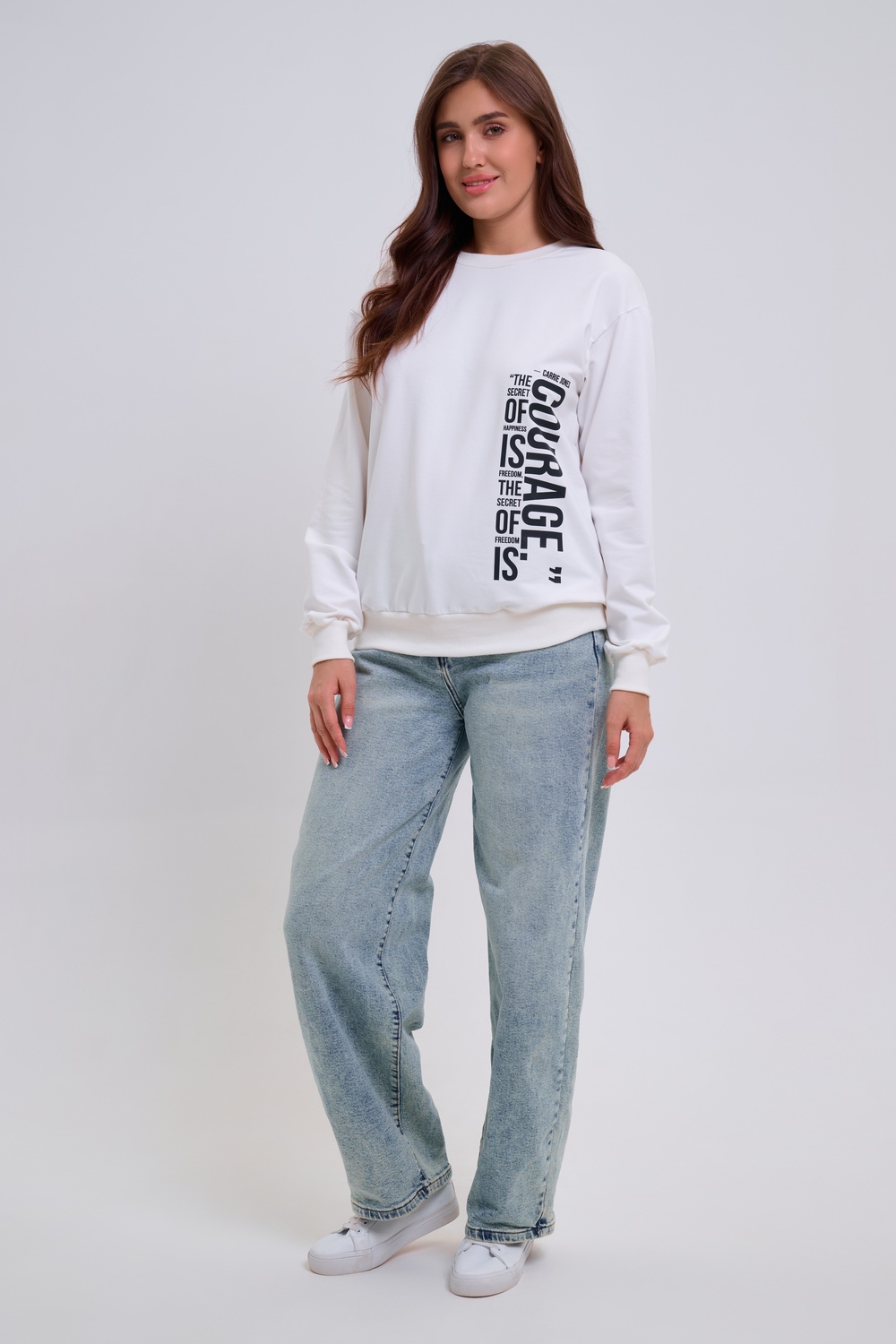 Женский свитшот свободного прямого кроя с круглой горловиной и слегка приспущенными плечами. Спереди нанесён принт в виде надписи COURAGE. Выполнен из мягкого и приятного материала футера 2-х нитки, обеспечивающего дополнительный комфорт и сохранение тепла даже в холодную погоду. Доступен в сдвоенных размерах, что удобно для подбора идеальной посадки. Подходит как для повседневной носки, так и для создания эффектных образов в любом стиле. Цвет: молочный; Материал: футер 2-х нитка;футер 2-х нитка; Состав: Хлопок 95%, П/Э 5%.