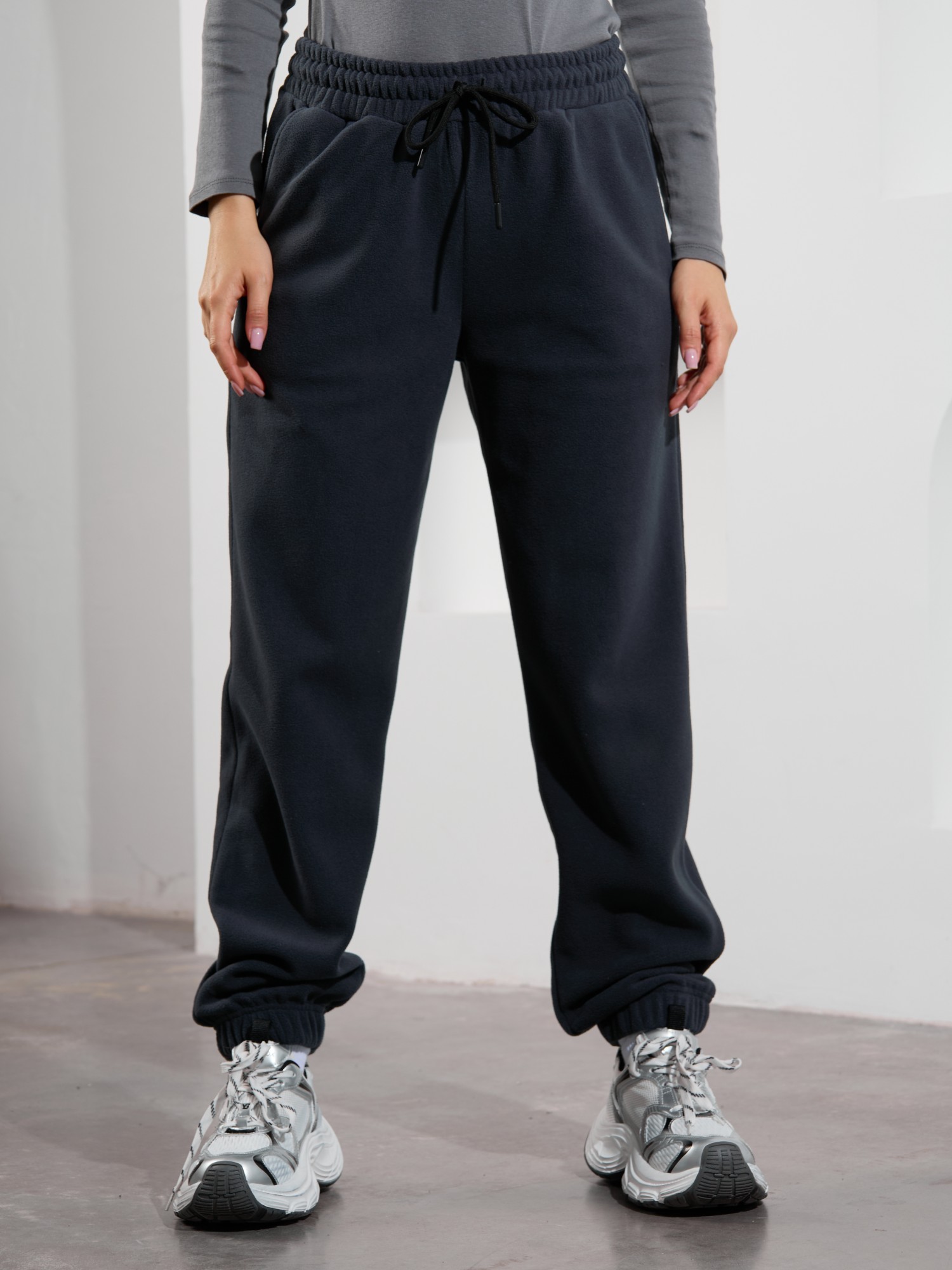 Брюки молодежные из трикотажного гладкокрашенного полотна «флис», длинные, на притачном поясе с эластичной тесьмой внутри и шнурком, продетым через две петли в центре пояса, с карманами в боковых швах и эластичной тесьмой по низу.