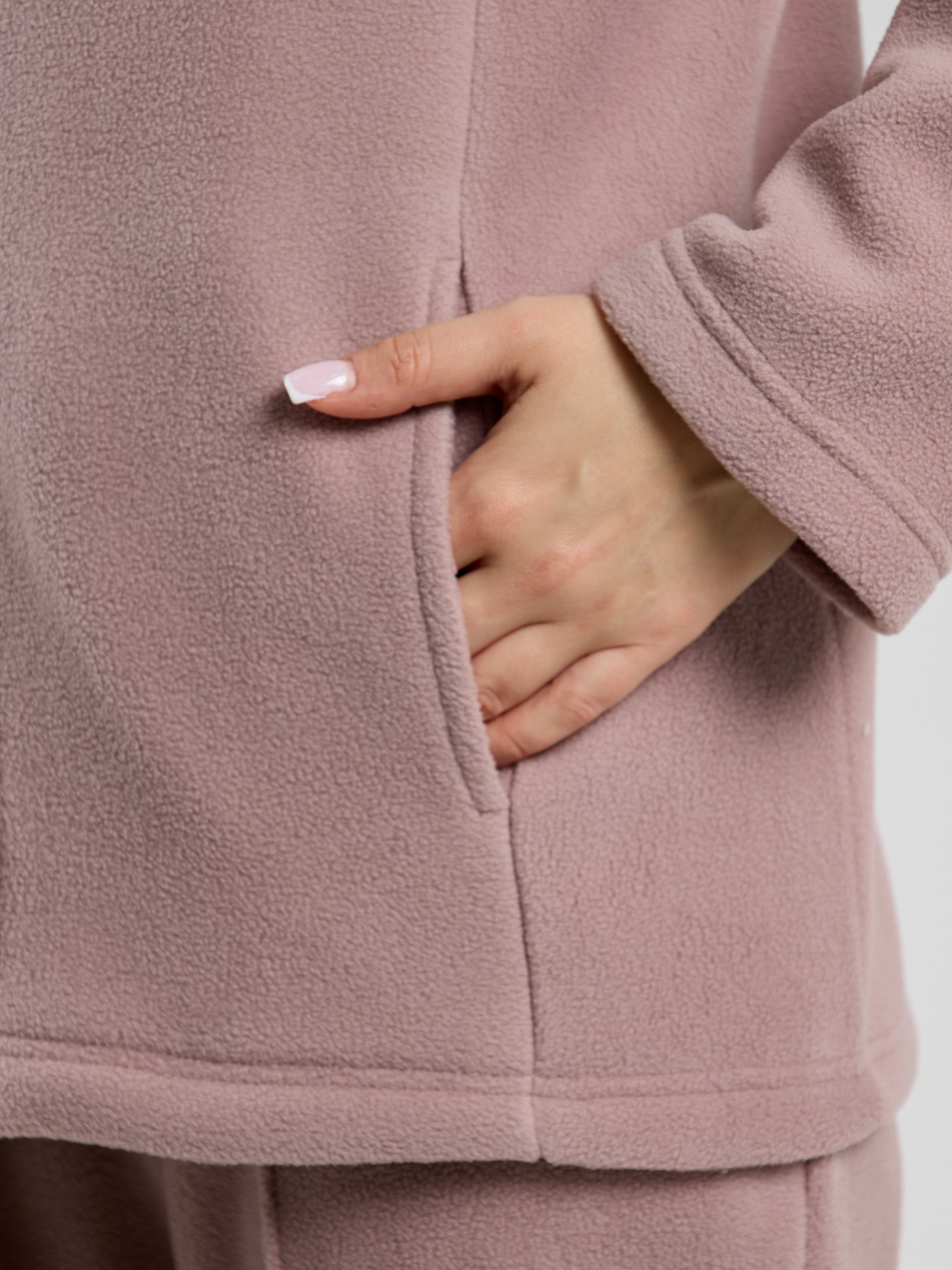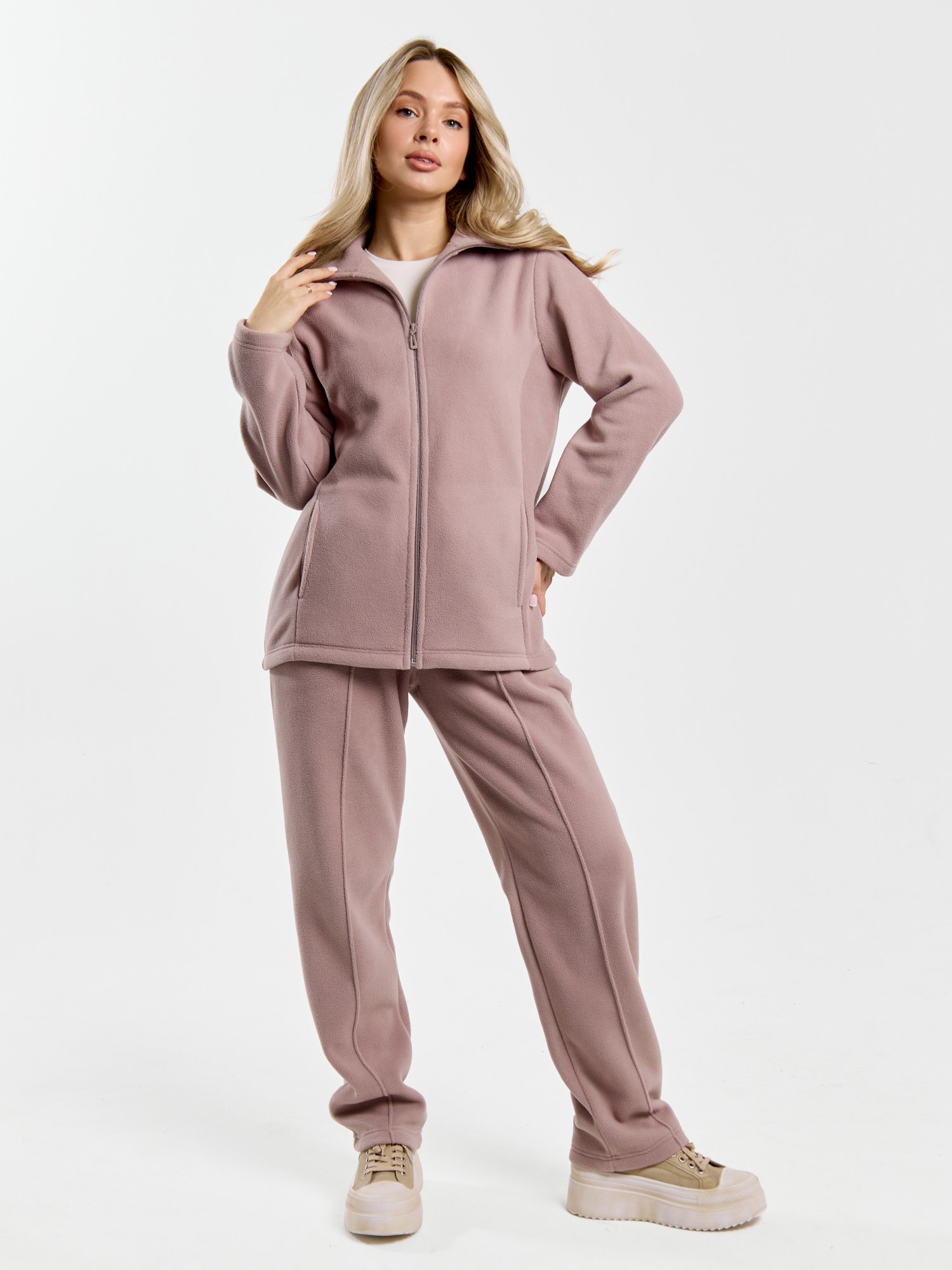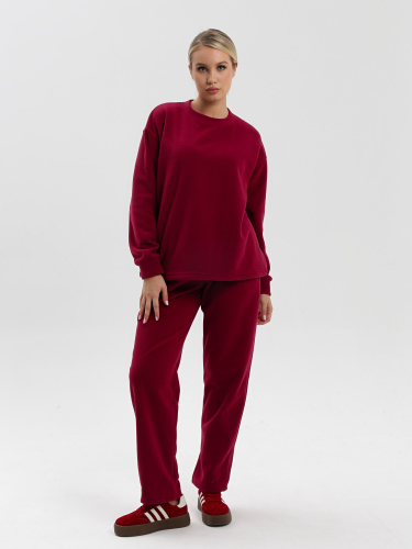 Костюм молодежный из гладкокрашенного трикотажного полотна «флис», Толстовка - полуприлегающего силуэта, с длинными втачными рукавами, воротником «стойка», карманами в рельефных швах, центральной бортовой застежкой на тесьму «молния». Брюки длинные, полуприлегающего силуэта, на притачном поясе с эластичной тесьмой внутри и карманами в боковых швах. Передние половины застрочены поцентральным линиям, низ брюк обработан подгибкой с вложением эластичной тесьмы и регулируется по ширине с помощью фиксаторов.