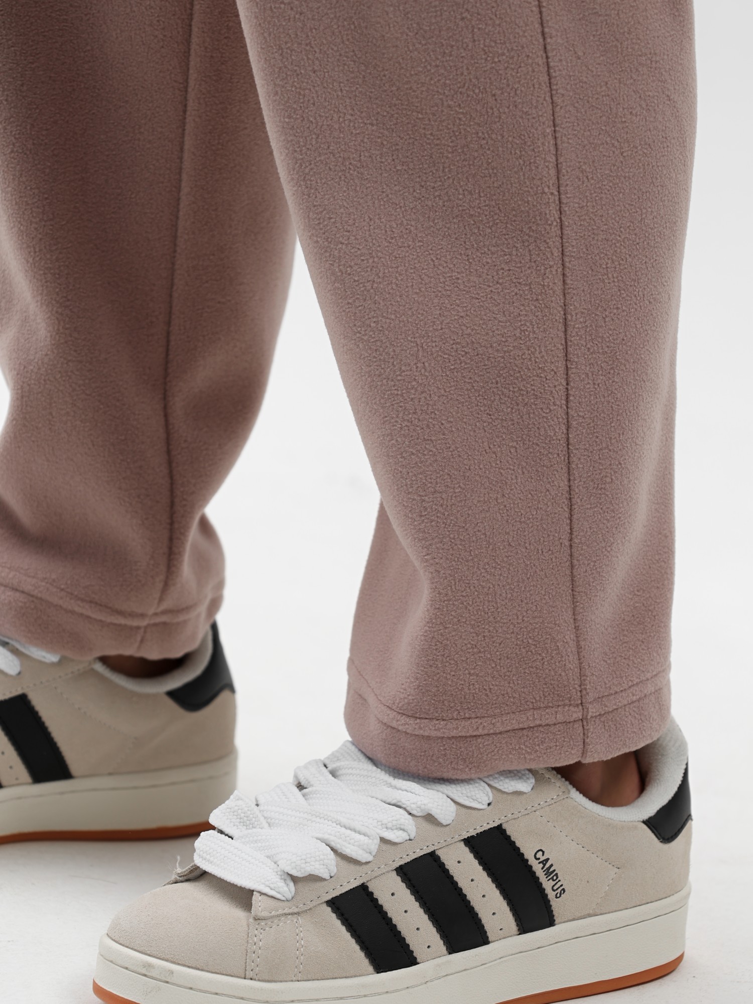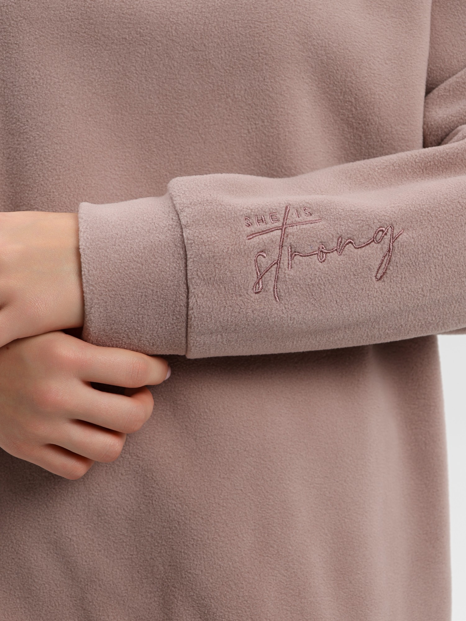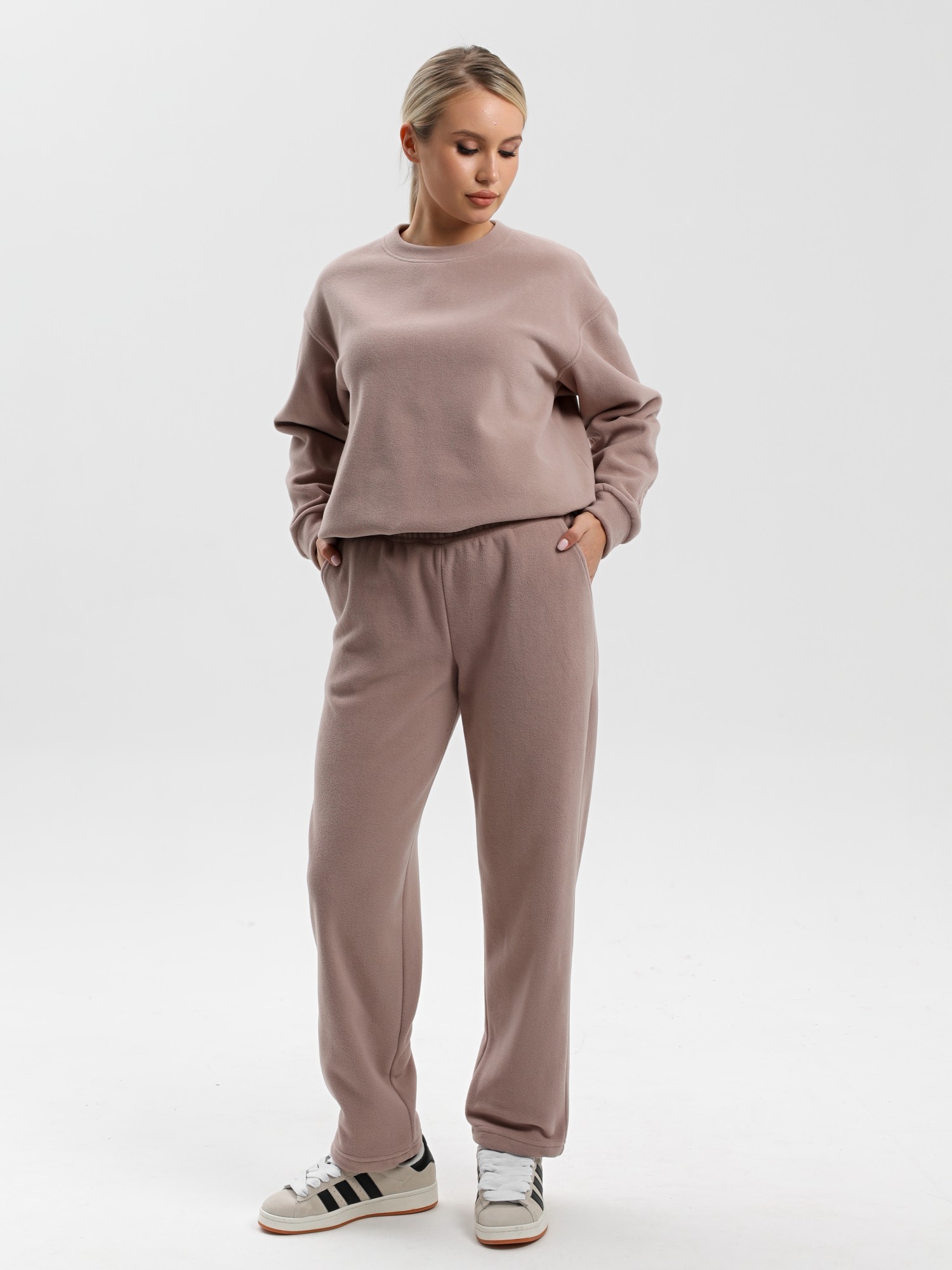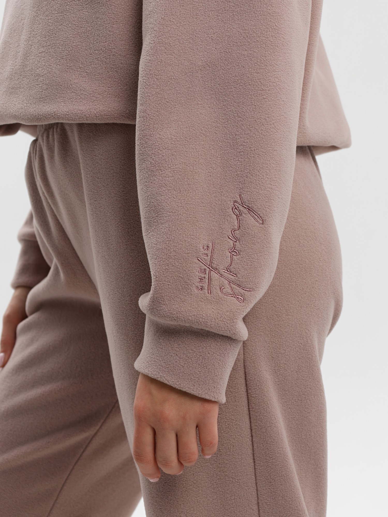 Костюм молодежный из гладкокрашенного полотна «флис», состоящий из джемпера и брюк. Джемпер – прямого силуэта, с длинными втачными рукавами, горловиной овальной формы, обработанной втачной планкой. На левом рукаве выполнена вышивка, низ обработан манжетами. По низу изделия подгибка с вложением эластичной тесьмы, регулируемой по длине фиксаторами.Брюки – длинные, свободные, на притачном поясе с эластичной тесьмой внутри, карманами в боковых швах. Нижние срезы обработаны подгибкой с вложением эластичной тесьмы, регулируемой фиксаторами.