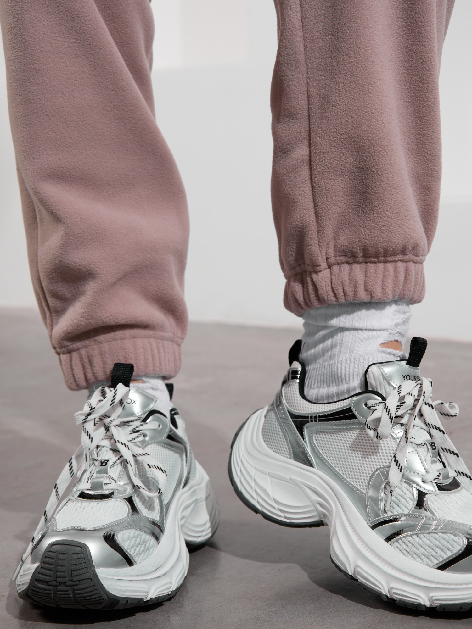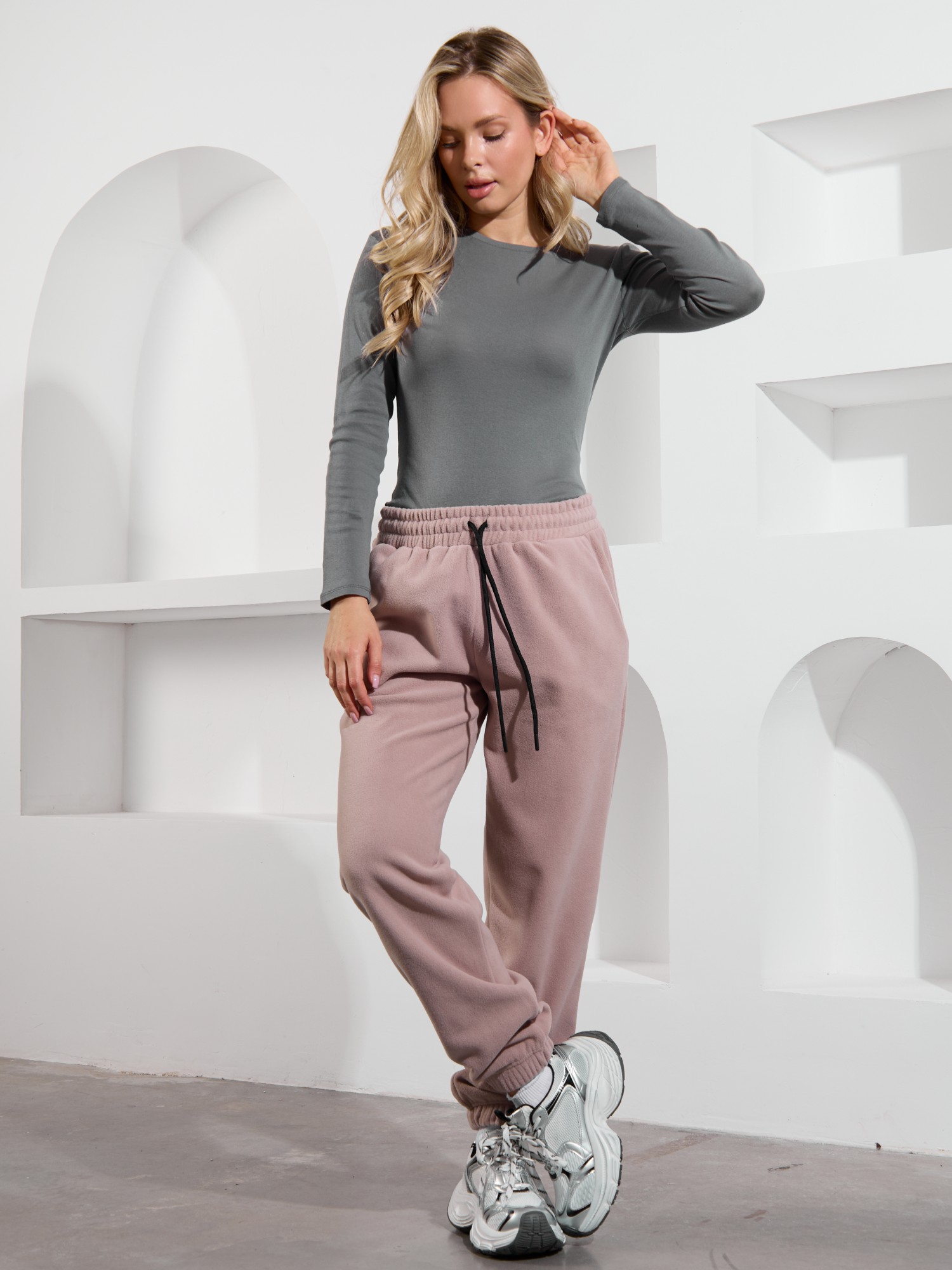 Брюки молодежные из трикотажного гладкокрашенного полотна «флис», длинные, на притачном поясе с эластичной тесьмой внутри и шнурком, продетым через две петли в центре пояса, с карманами в боковых швах и эластичной тесьмой по низу.