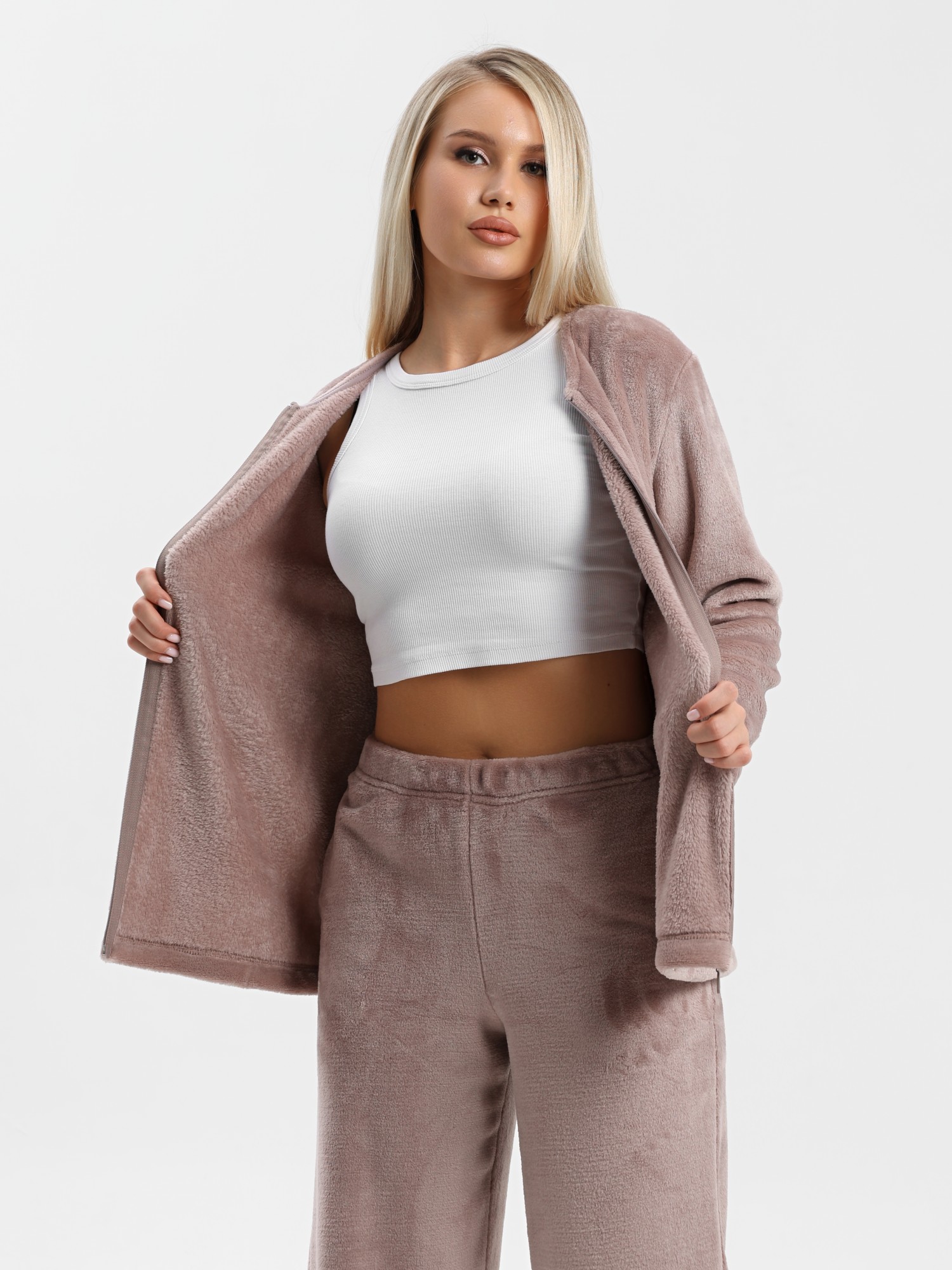 Костюм молодежный из гладкокрашенного тканого полотна «велсофт», состоящий из куртки и брюк. Куртка - прямого силуэта, с длинными втачными рукавами, без воротника с горловиной овальной формы, центральной бортовой застежкой на тесьму «молния». На левой полочке на подгибке, настрочен декоративный элемент.Брюки – длинные, свободные, с карманами в боковых швах и с эластичной тесьмой по талии.