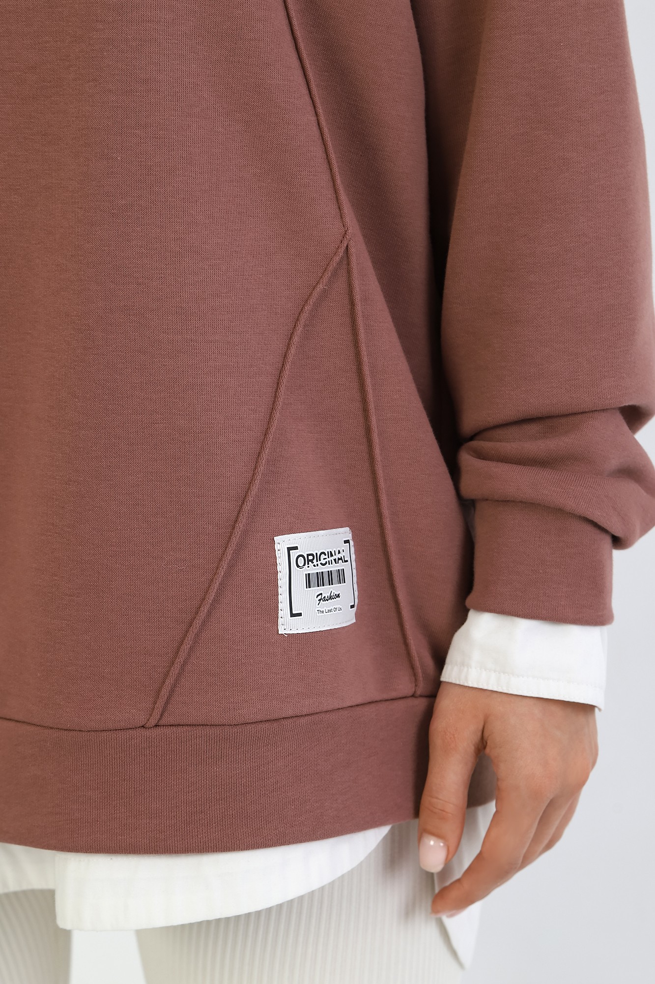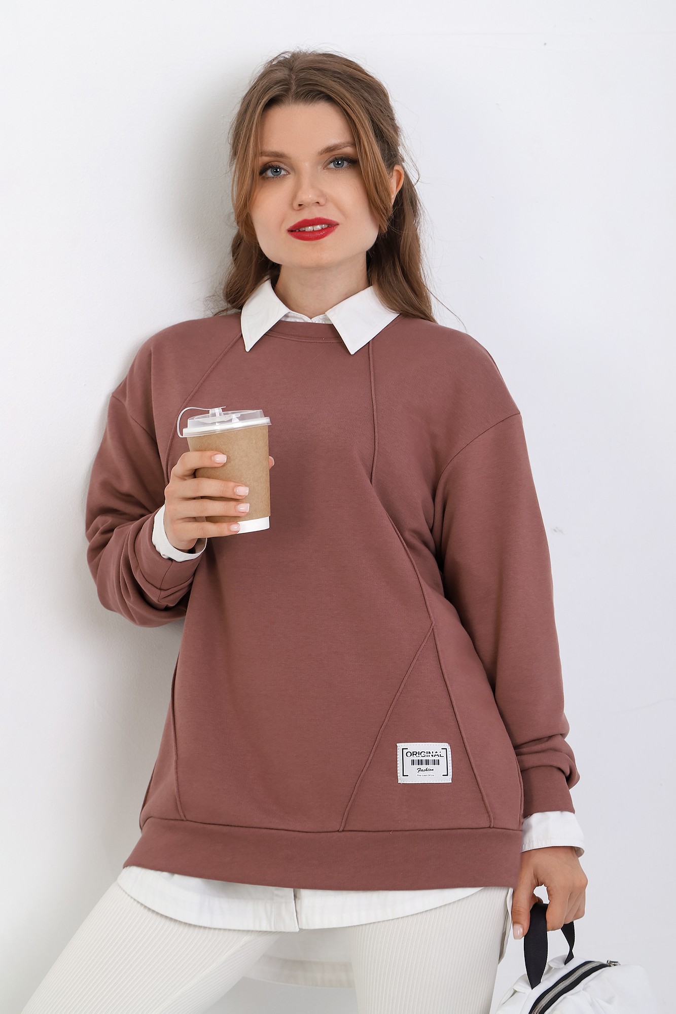Джемпер молодежный из трикотажного полотна «футер» трехнитка-петля со спущенным плечом, длинными рукавами и горловиной овальной формы, обработанной втачной планкой. На полочке выполнены четыре ассиметричные отделочные строчки. Рукава – с манжетами, низ изделия на притачном поясе, с левой стороны настрочен декоративный элемент.