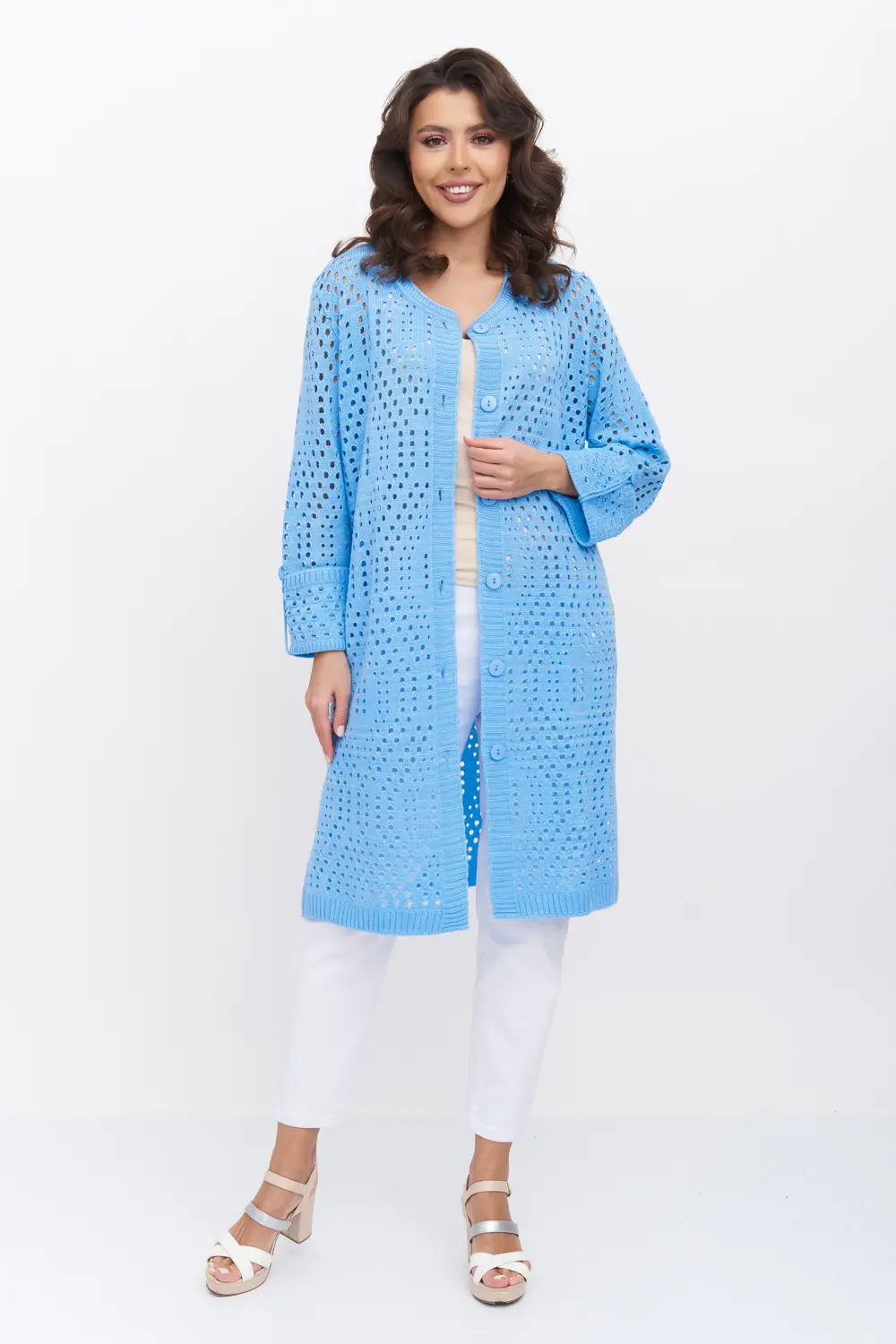 Ажурный кардиган  с круглой горловиной, застегивается на крупные пуговицы. Рукава втачные длиной 7/8 с манжетом и патой на пуговице. голубой