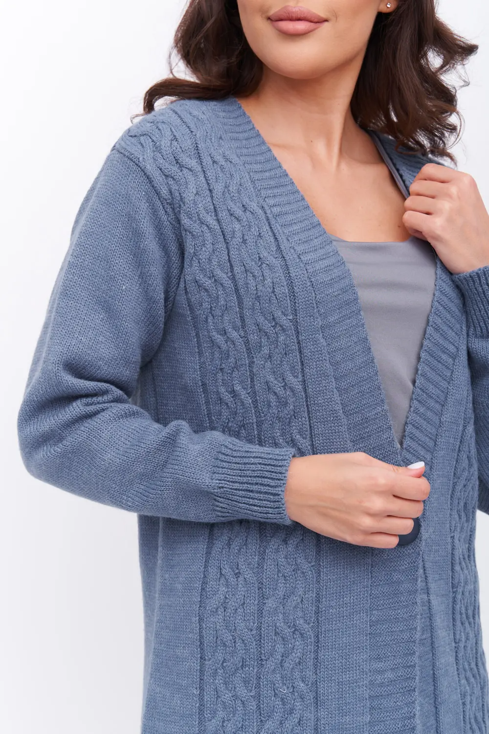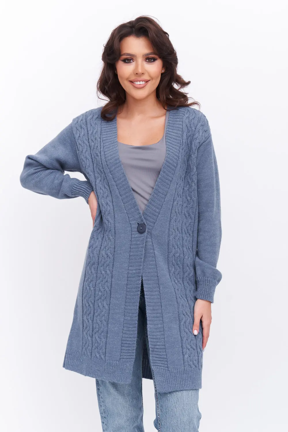 Модель имеет застёжку на пуговицу. Полочки выполнены структурным узором "косы".  Модель отлично подойдет к платью, юбке и брюкам.  Отличное изделие для прохладного времени года для повседневных прогулок на улице или дополняющая деловой стиль на работу в офис или институт. джинс
