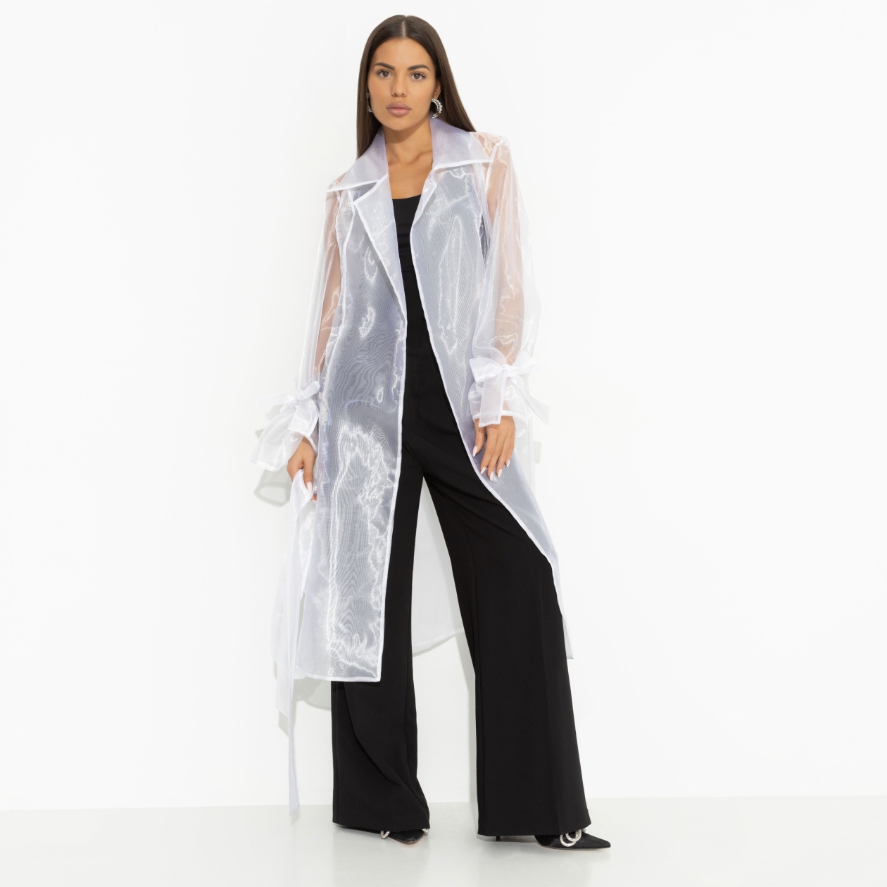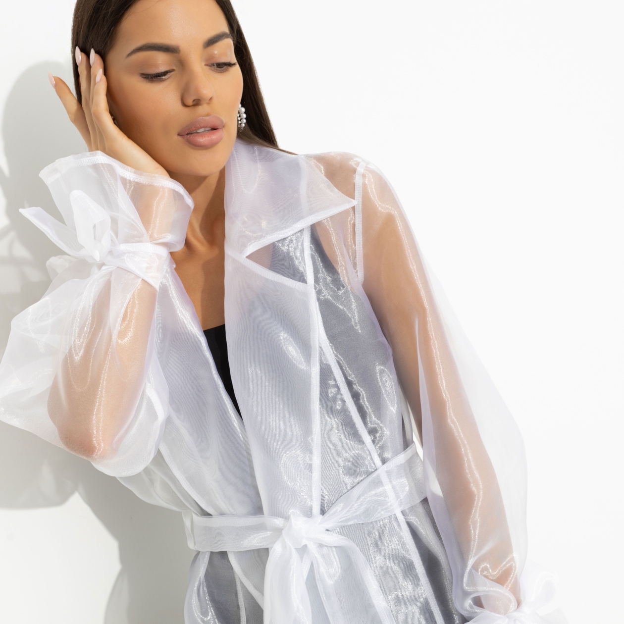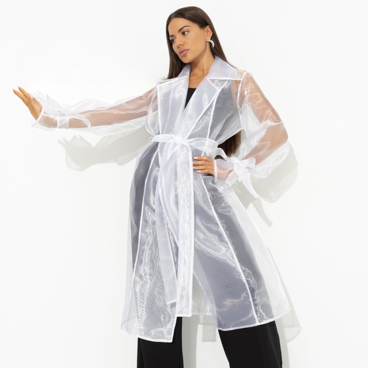 Ты хотела удивить его, а удивила сама себя. Кардиган CHARUTTI в прозрачном белом цвете пришел в твою жизнь, словно праздник. И теперь поход на почту, в кафе с подругами, на свидание и в музей выглядят совсем иначе. Кардиган в стиле тренча. Изделие с лацканами. Пояс в тон изделия в комплекте. Рукава оформлены завязками. Кардиган без застежек. Изделие полностью прозрачное. Походит в качестве второго слоя.