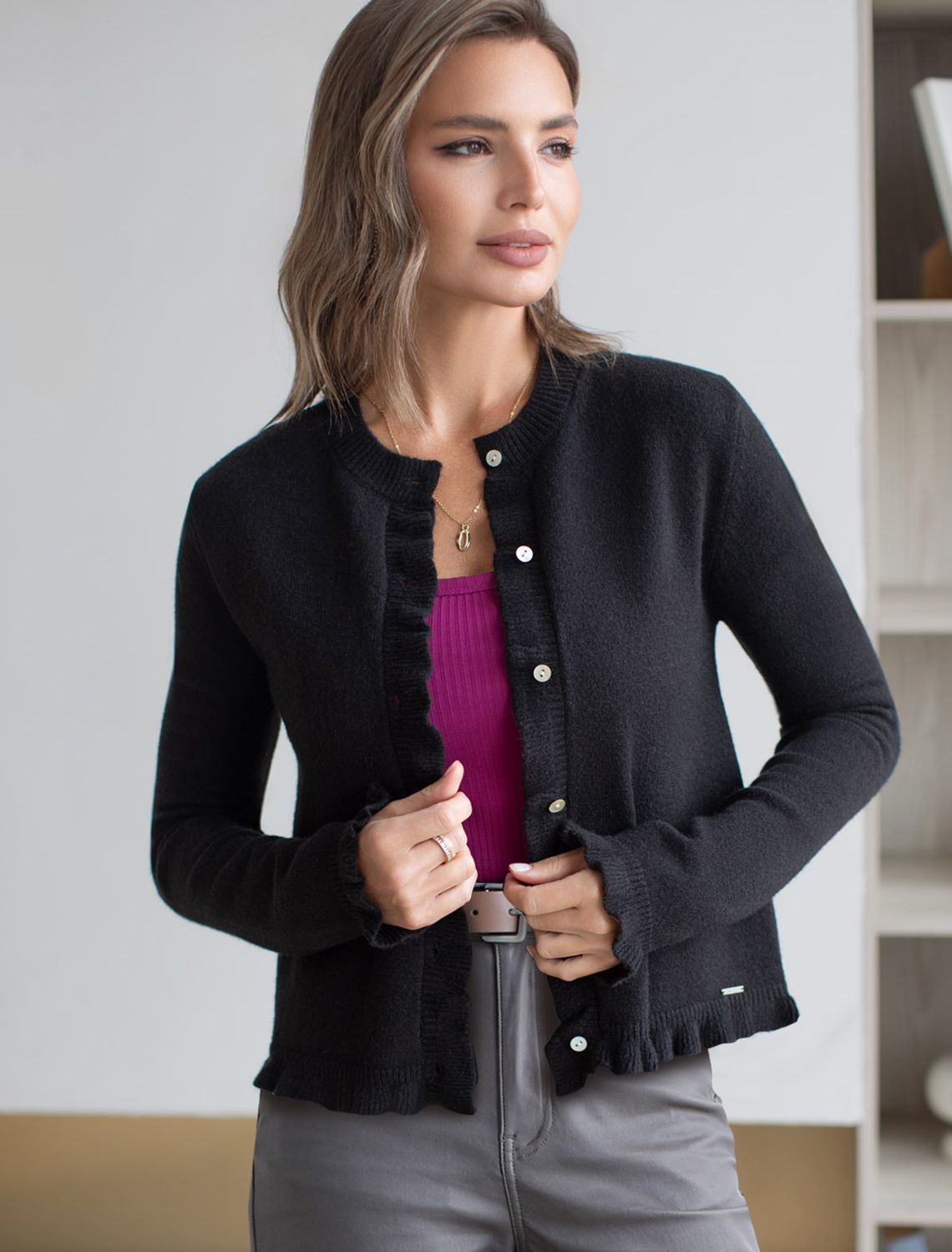 Кардиган выполнен из мягкой пряжи с Романтичности прямому силуэту добавляют мягкие воланы по линии пуговиц, на манжетах и краю изделия. Застежка на пуговицы из натурального перламутра. Изделие очень приятное к телу, совершенно не колется и отлично сохраняет тепло. Сочетается в костюме с брюками D38.013, D38.012 и юбкой D36.016