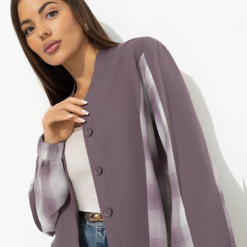 Кардиган «Контракт на роскошь» — это не просто одежда, это настоящая находка для тех, кто ценит комфорт и стиль в каждой детали. Представьте себе уютное вечернее чаепитие с друзьями, где вы выступаете хозяйкой с безупречным вкусом. Этот комбинированный кардиган из трикотажа «нейлон-рома» и «блузочного крепа» заставит вас почувствовать себя настоящей королевой. Его свободный крой и V-образный вырез добавляют нотку элегантности и шарма, делая ваш образ непринуждённым и привлекательным. А пуговицы — это не просто застёжка, это акцент, который привлекает внимание.