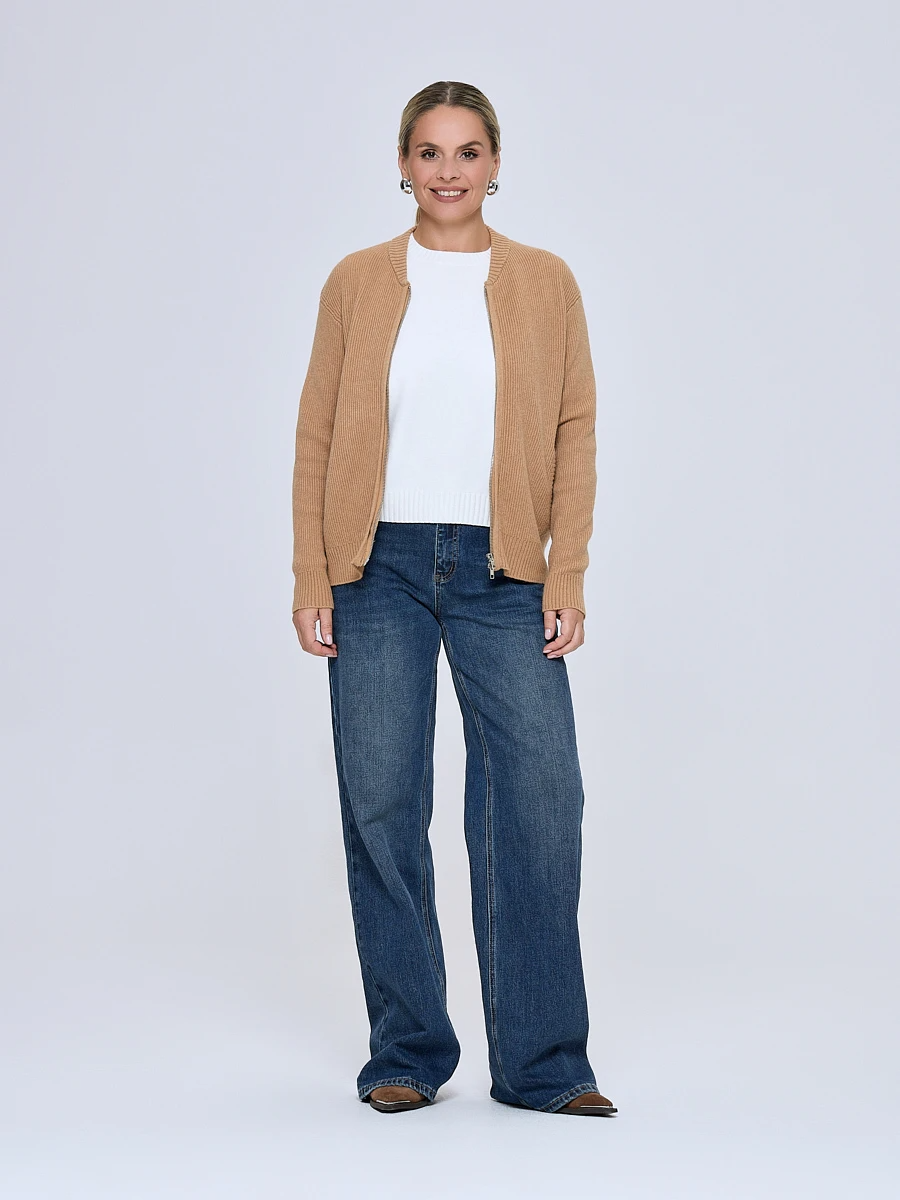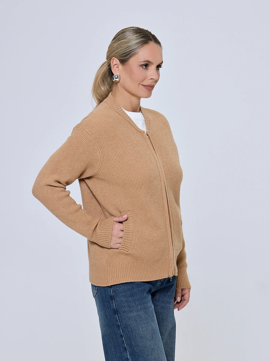 Женский кардиган коричневого цвета выполнен из мягкой и уютной трикотажной пряжи, которая сочетает в себе нежность кашемира, практичность акрила и прочность нейлона. Лаконичный дизайн с прямым силуэтом и застёжкой на молнию делает модель универсальной и удобной для повседневной носки. Кардиган имеет аккуратный воротник-стойку и эластичные манжеты, которые обеспечивают комфортную посадку и защищают от прохлады.