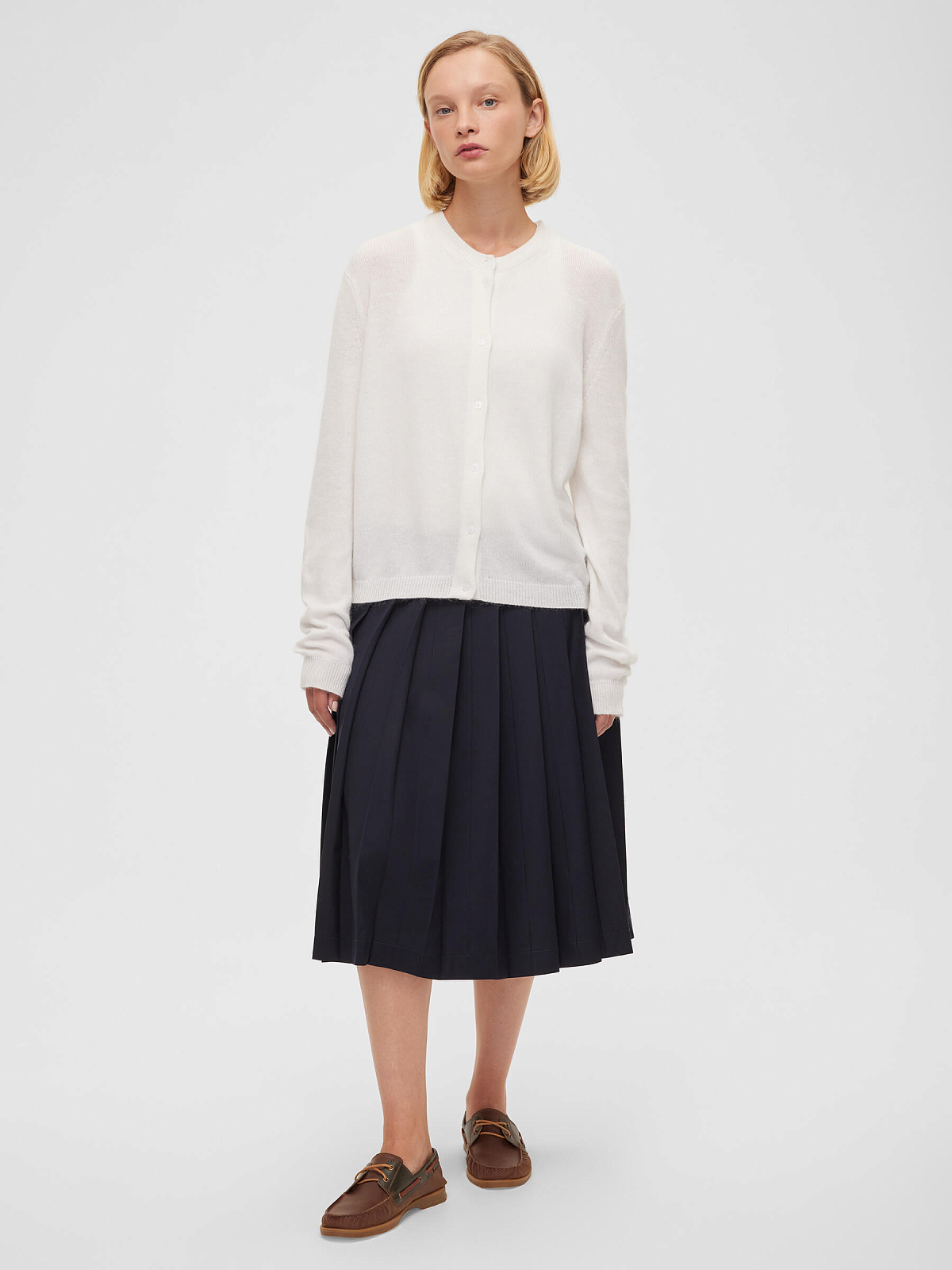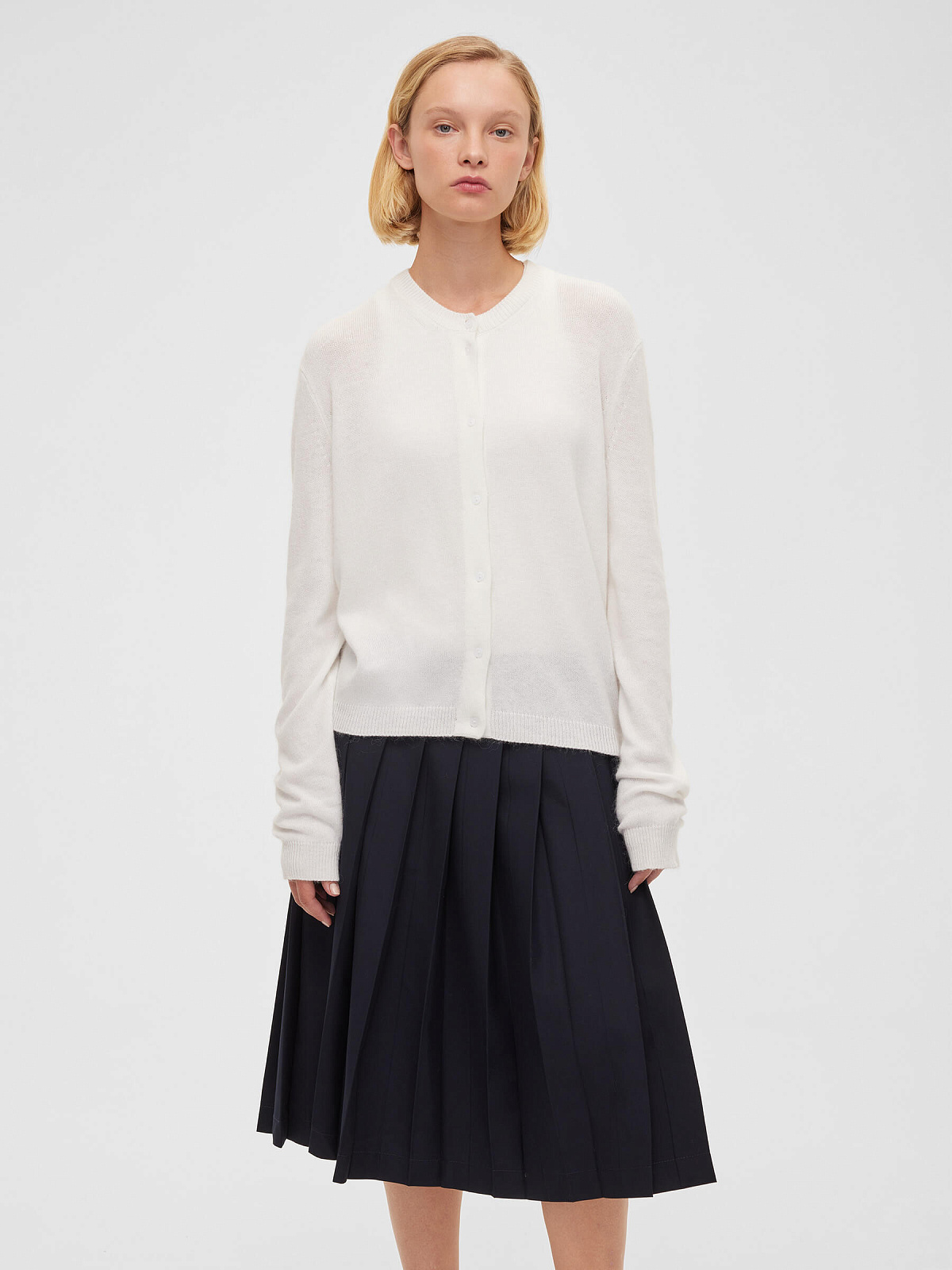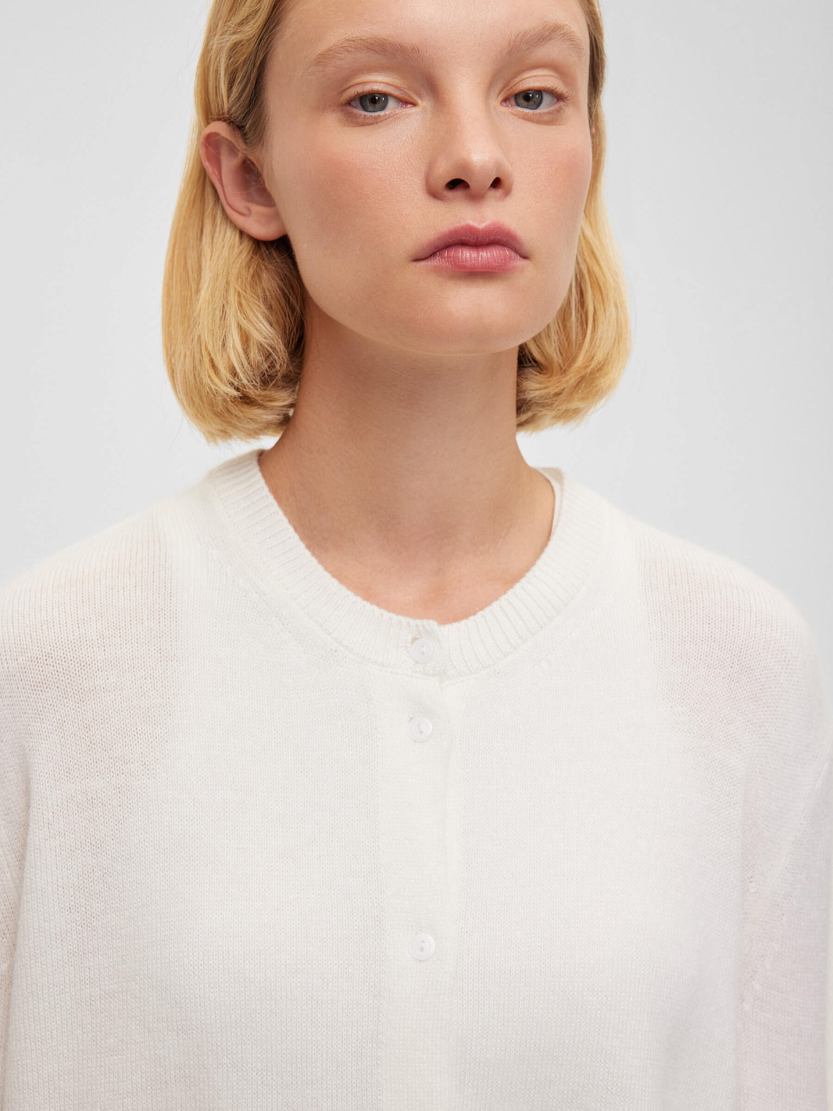 Кардиган прямого кроя с застежкой на пуговицы по переду и круглым вырезом горловины. Изготовлен из смесовой пряжи  улучшенных свойств. Комбинация пуха ангорского кролика и тонкой шерсти в составе создают текстуру с характерным ворсом. Тонкая вязка 12 класса.