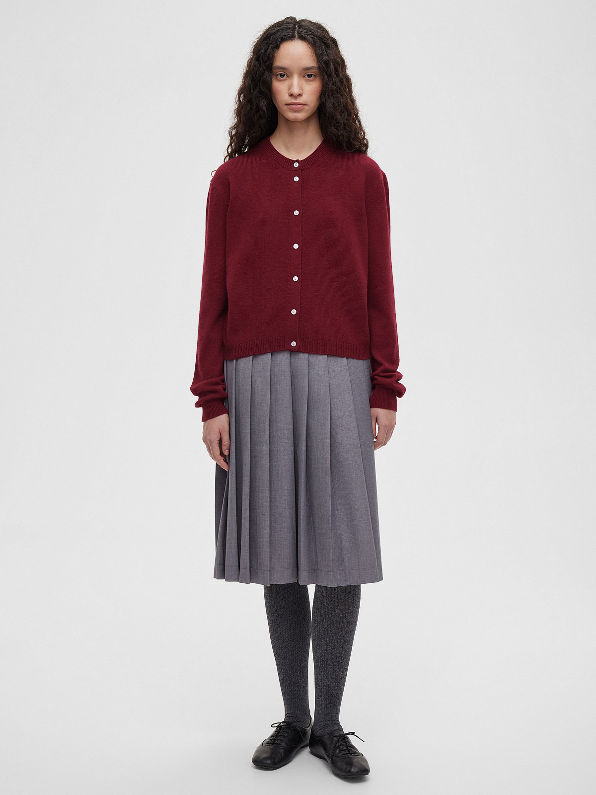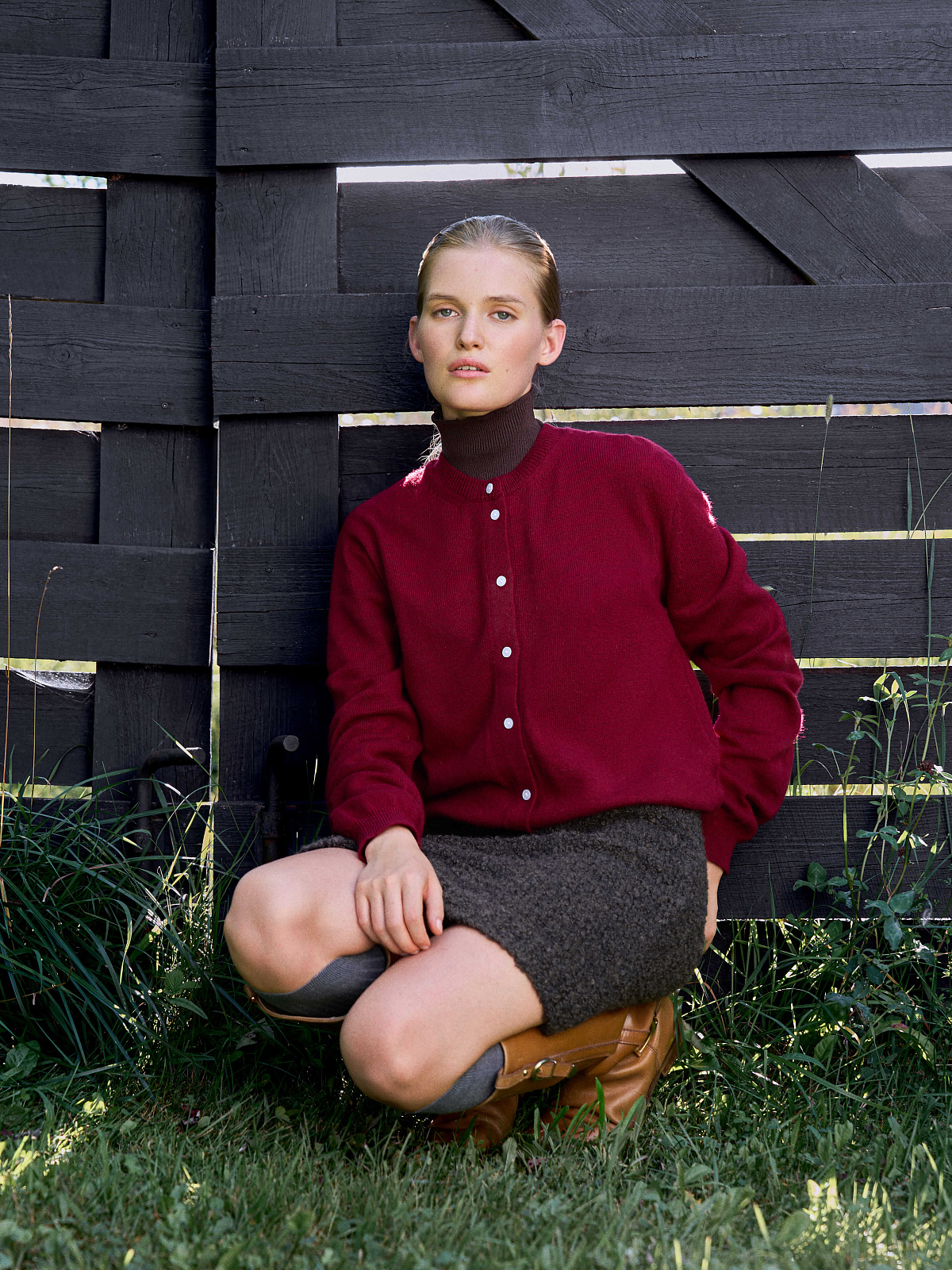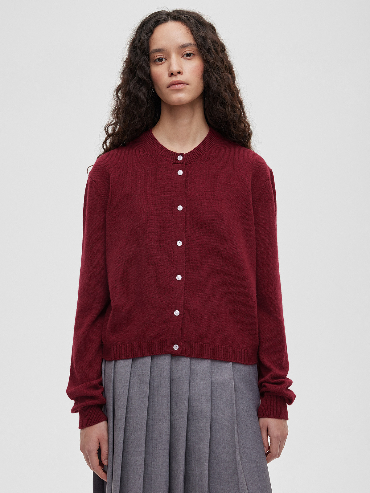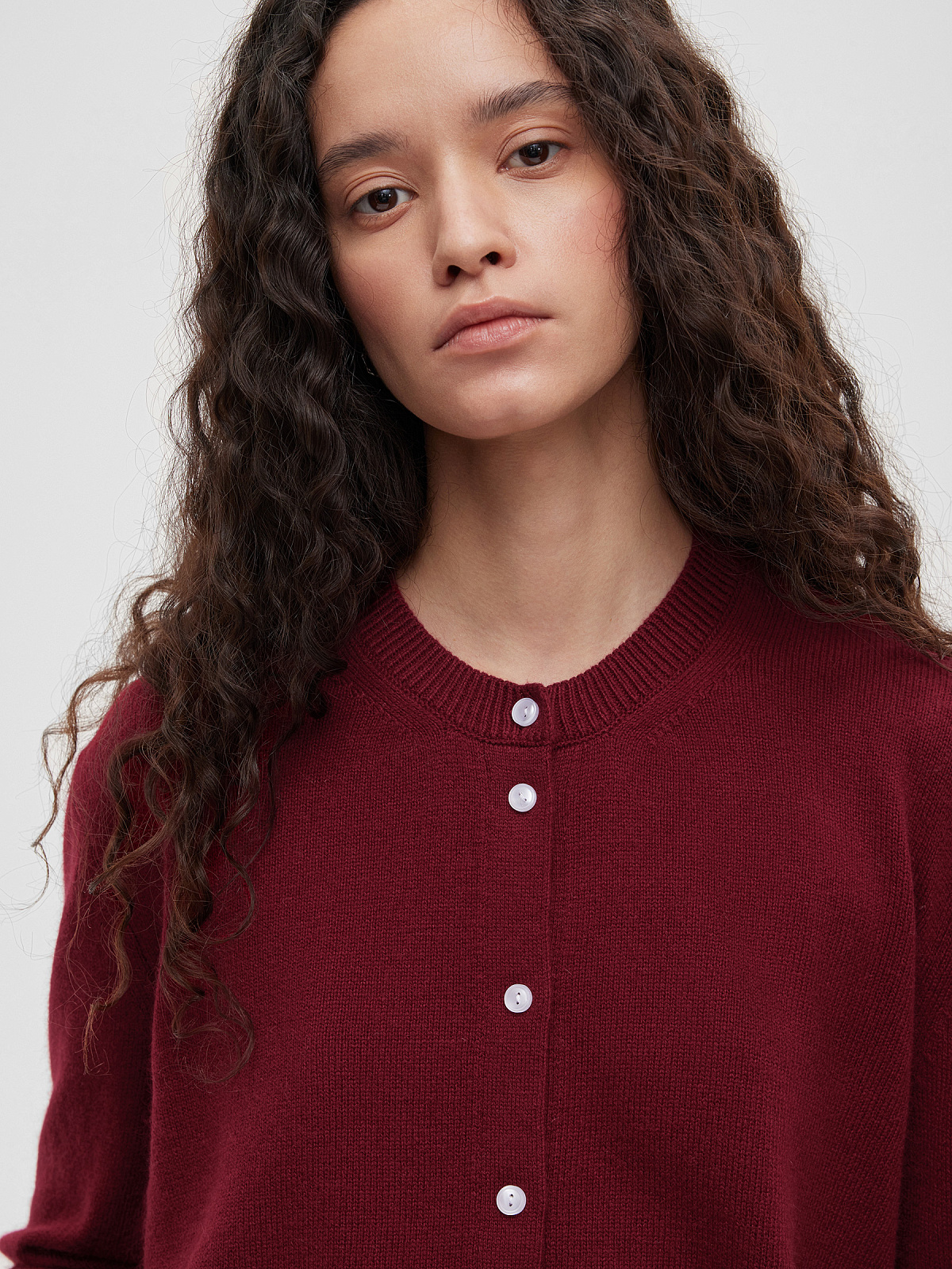 Кардиган прямого кроя с застежкой на пуговицы по переду и круглым вырезом горловины. Изготовлен из смесовой пряжи  улучшенных свойств. Комбинация пуха ангорского кролика и тонкой шерсти в составе создают текстуру с характерным ворсом. Тонкая вязка 12 класса.
