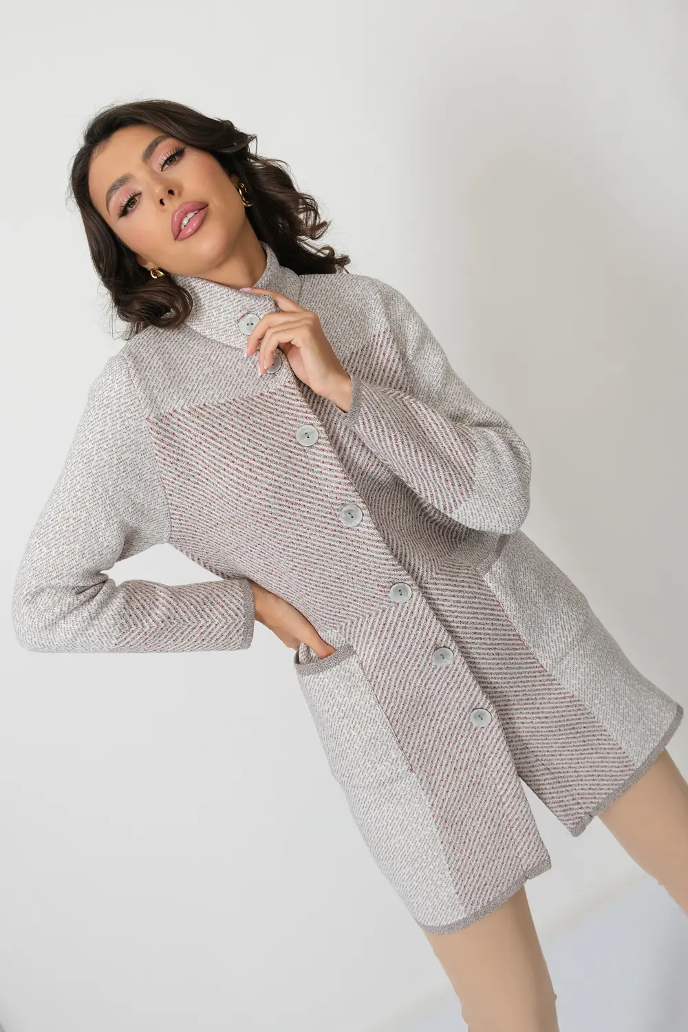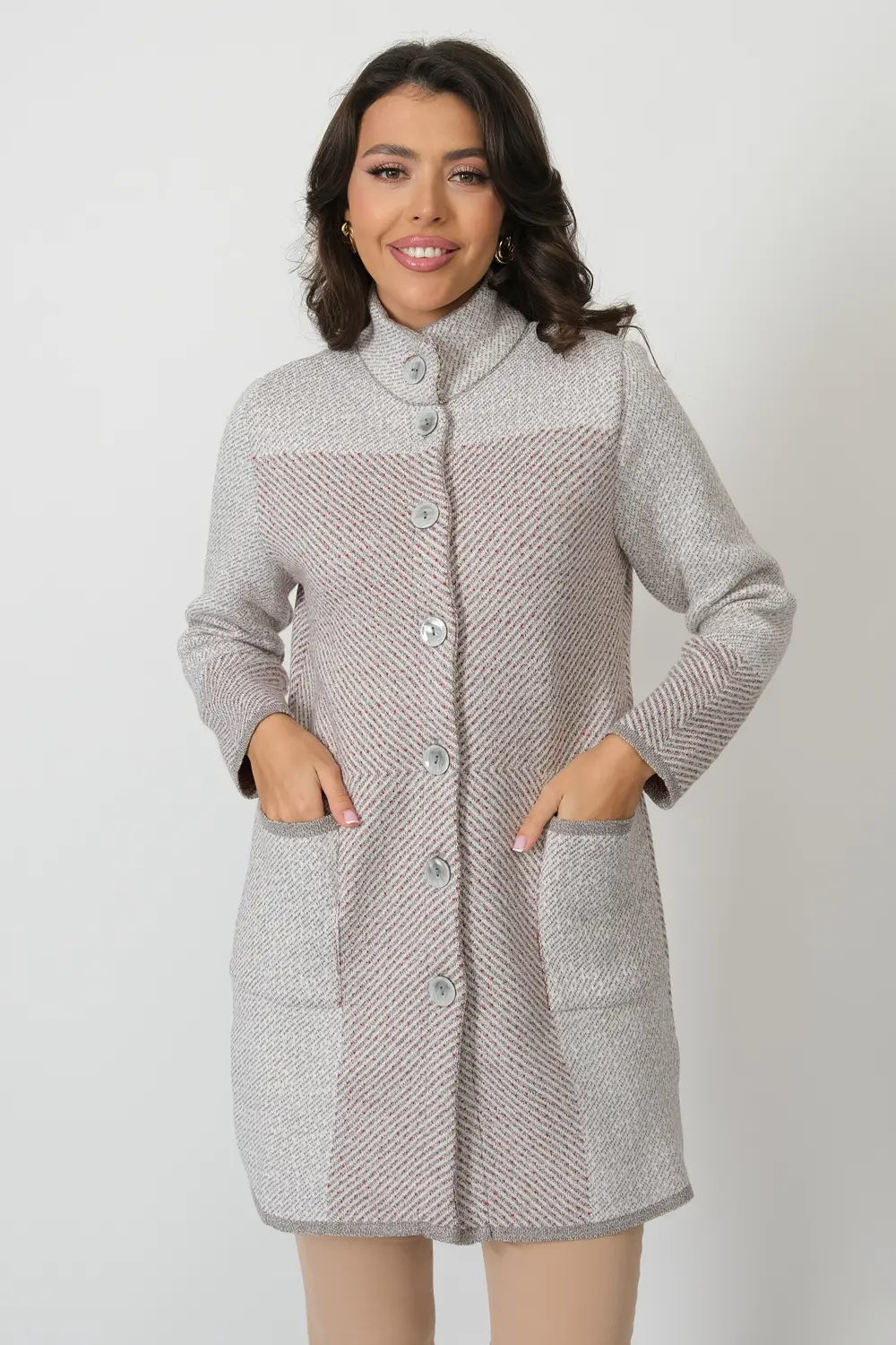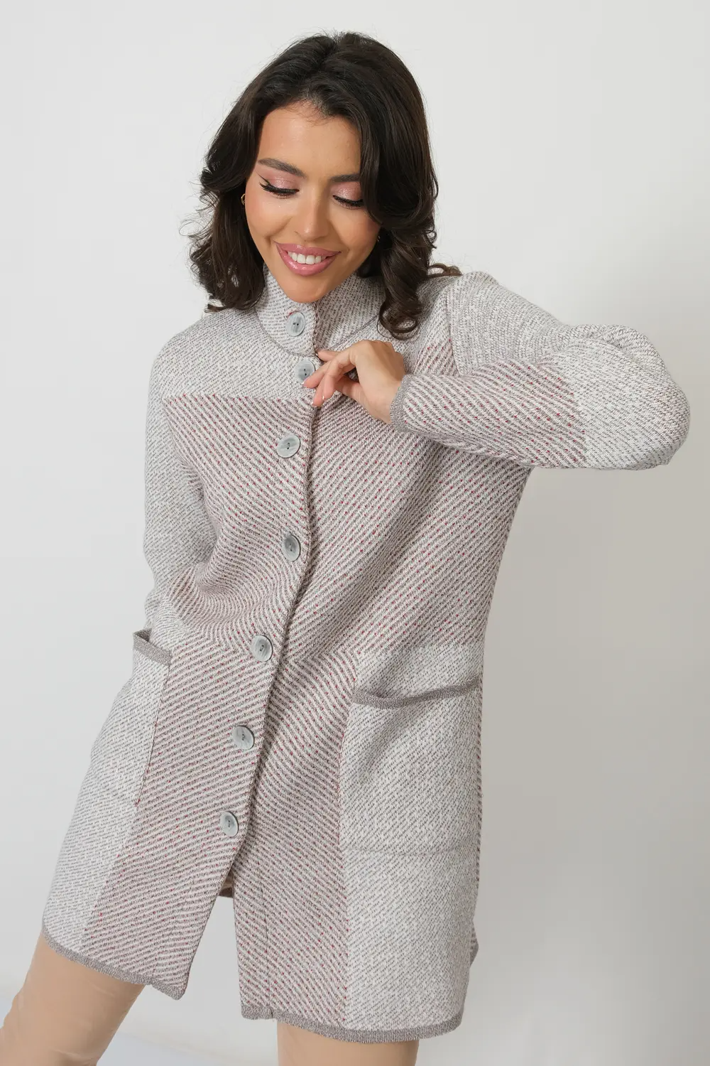 Женский вязаный кардиган полуприлегающего силуэта с воротником-стойкой. Кардиган застегивается на пуговицы. Рукава втачные длинные.  Накладные карманы прямоугольной  формы. Кардиган выполнен жаккардовым переплетением. кофейный микс